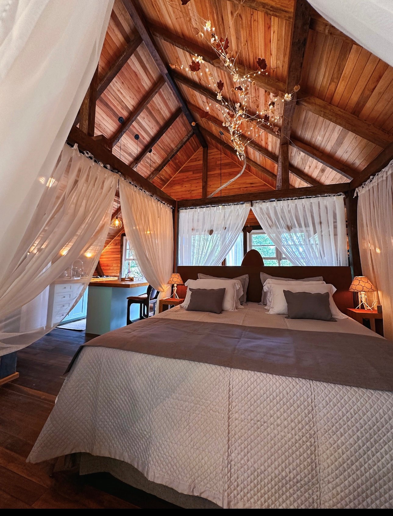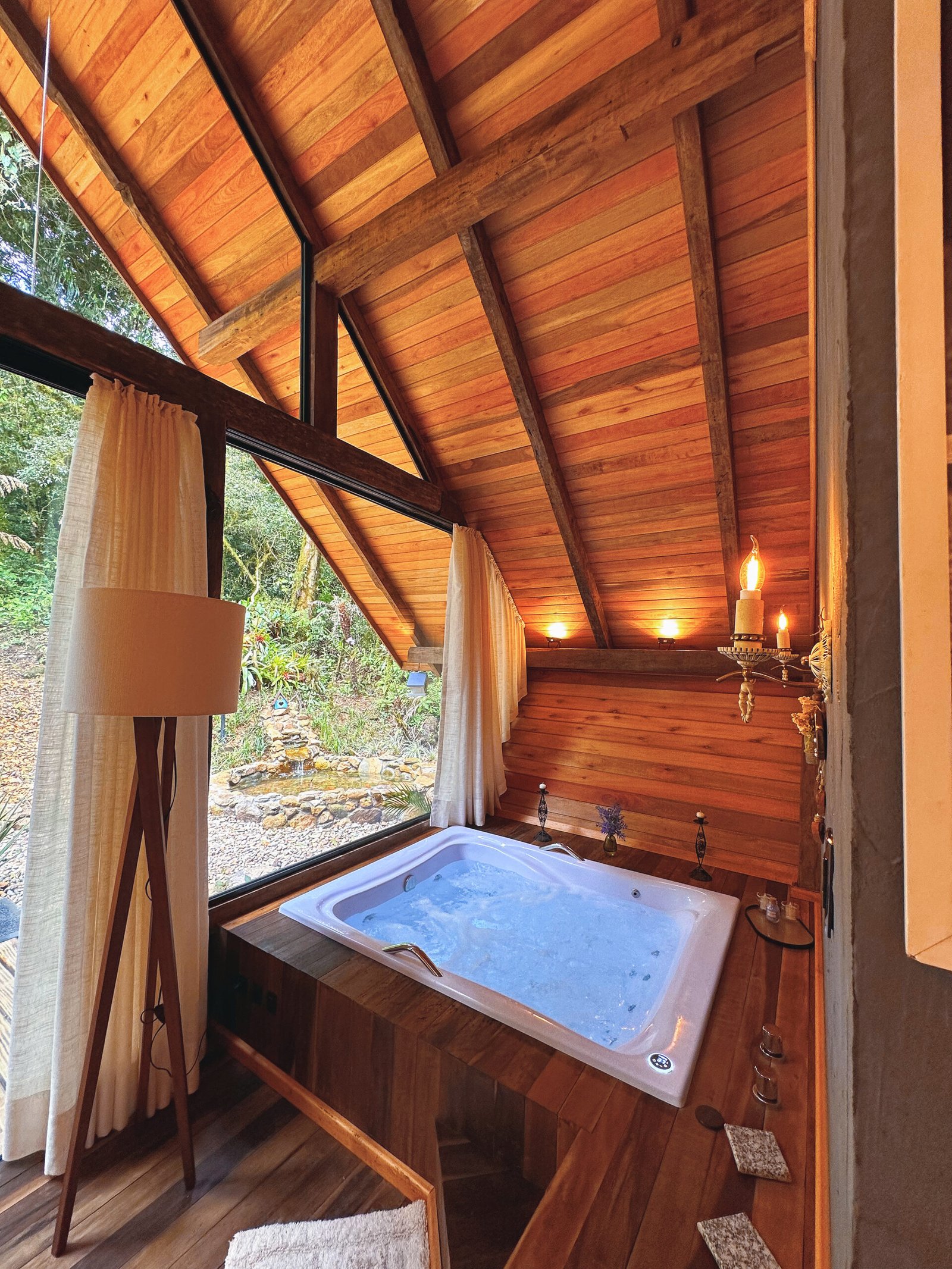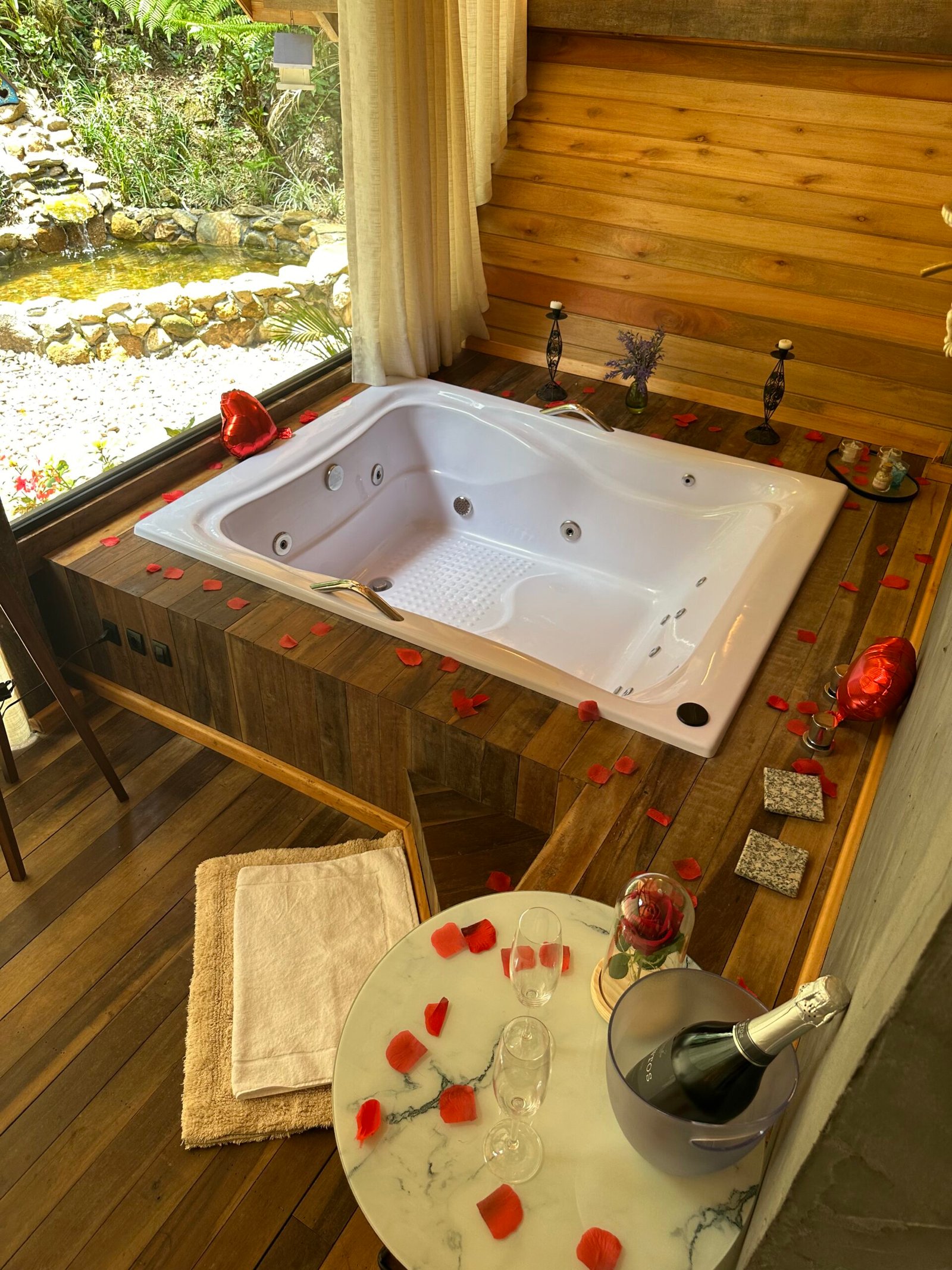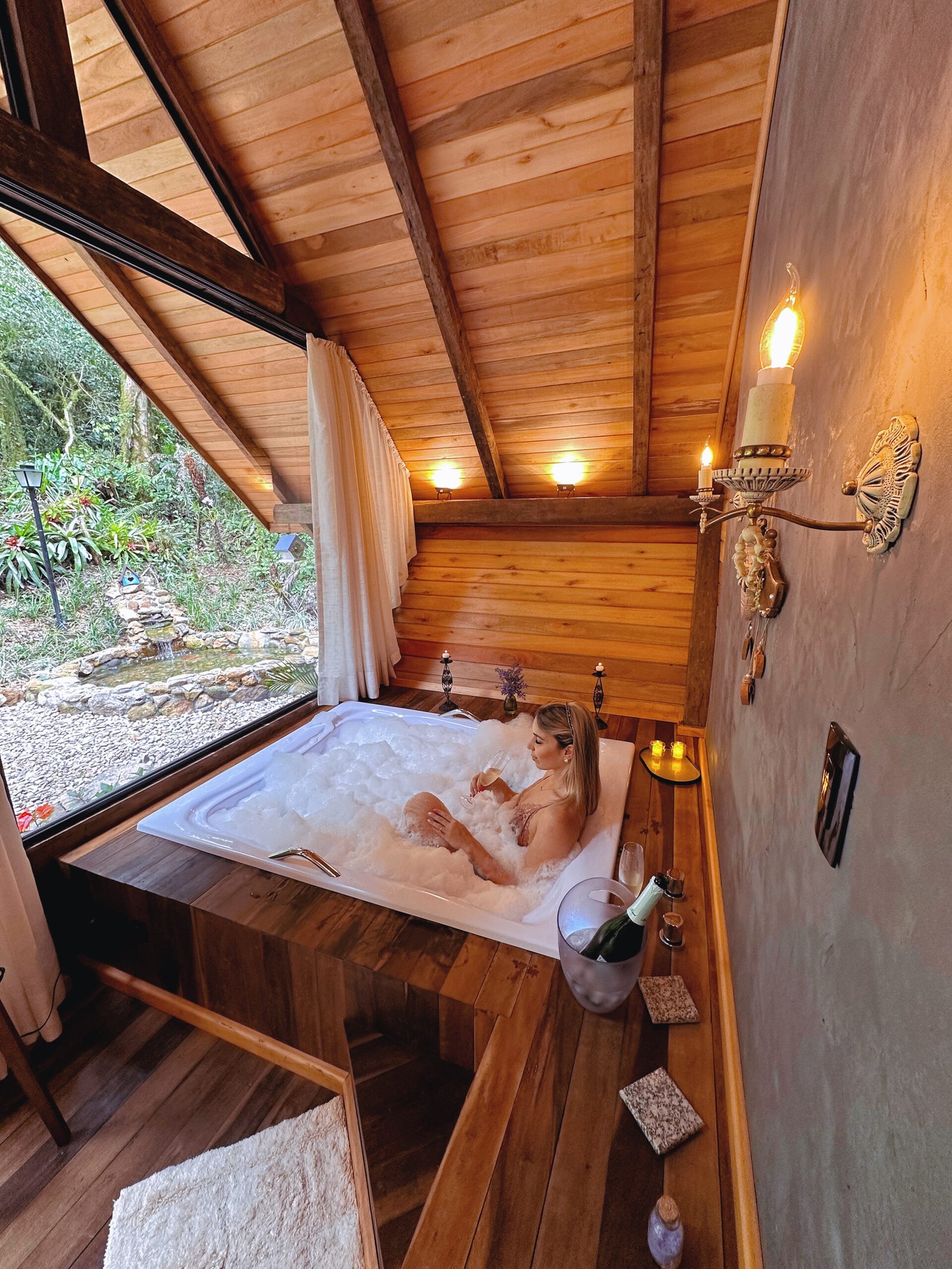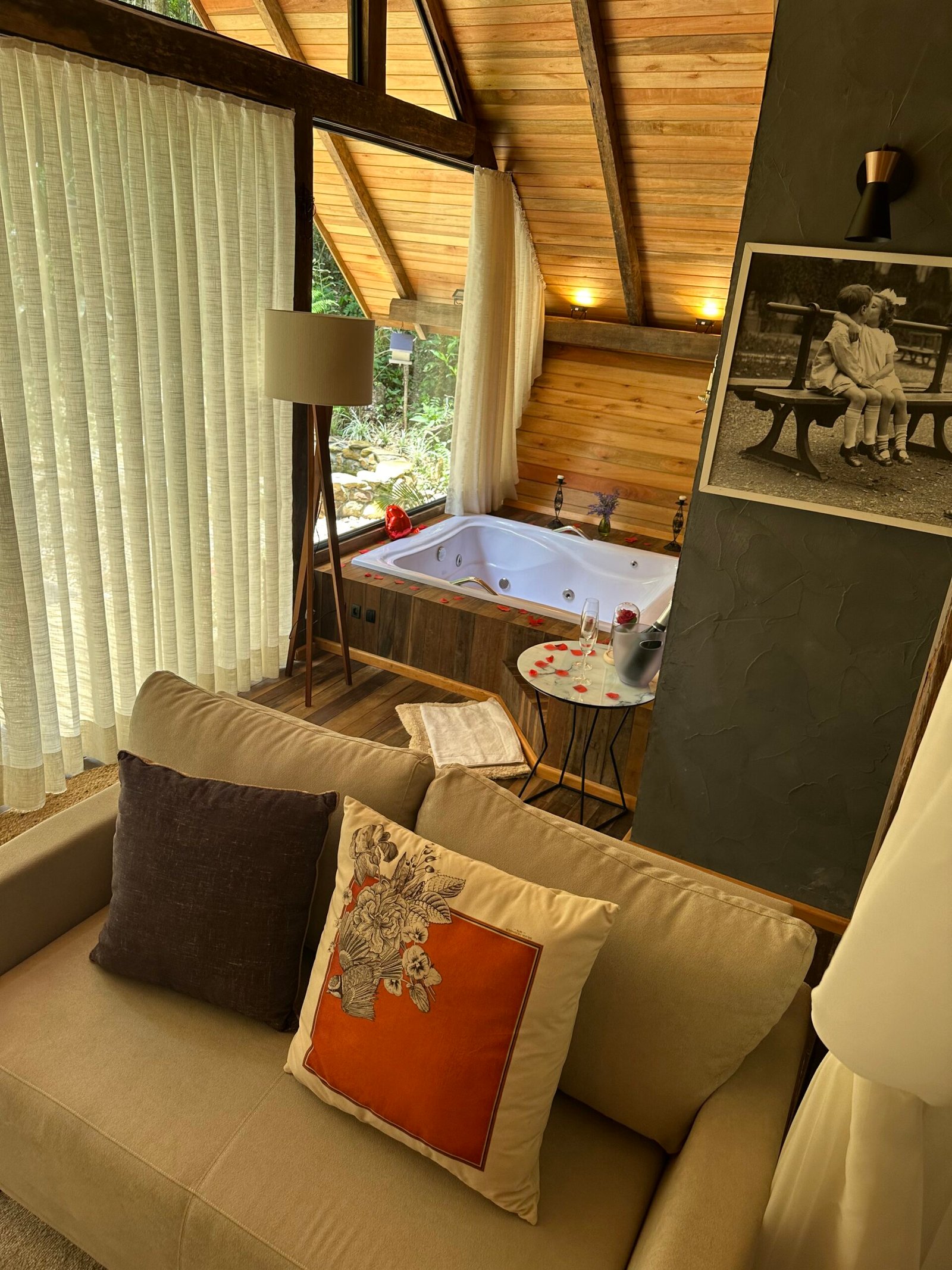 A Cabana do Bosque foi meticulosamente projetada para proporcionar a casais momentos mágicos, onde podem se perder em olhares apaixonados enquanto desfrutam de uma vista espetacular da natureza. Esta experiência é realçada seja na banheira dupla, cuidadosamente selecionada por seu design único, ou na confortável cama King Size, que promete noites de sono tranquilas.