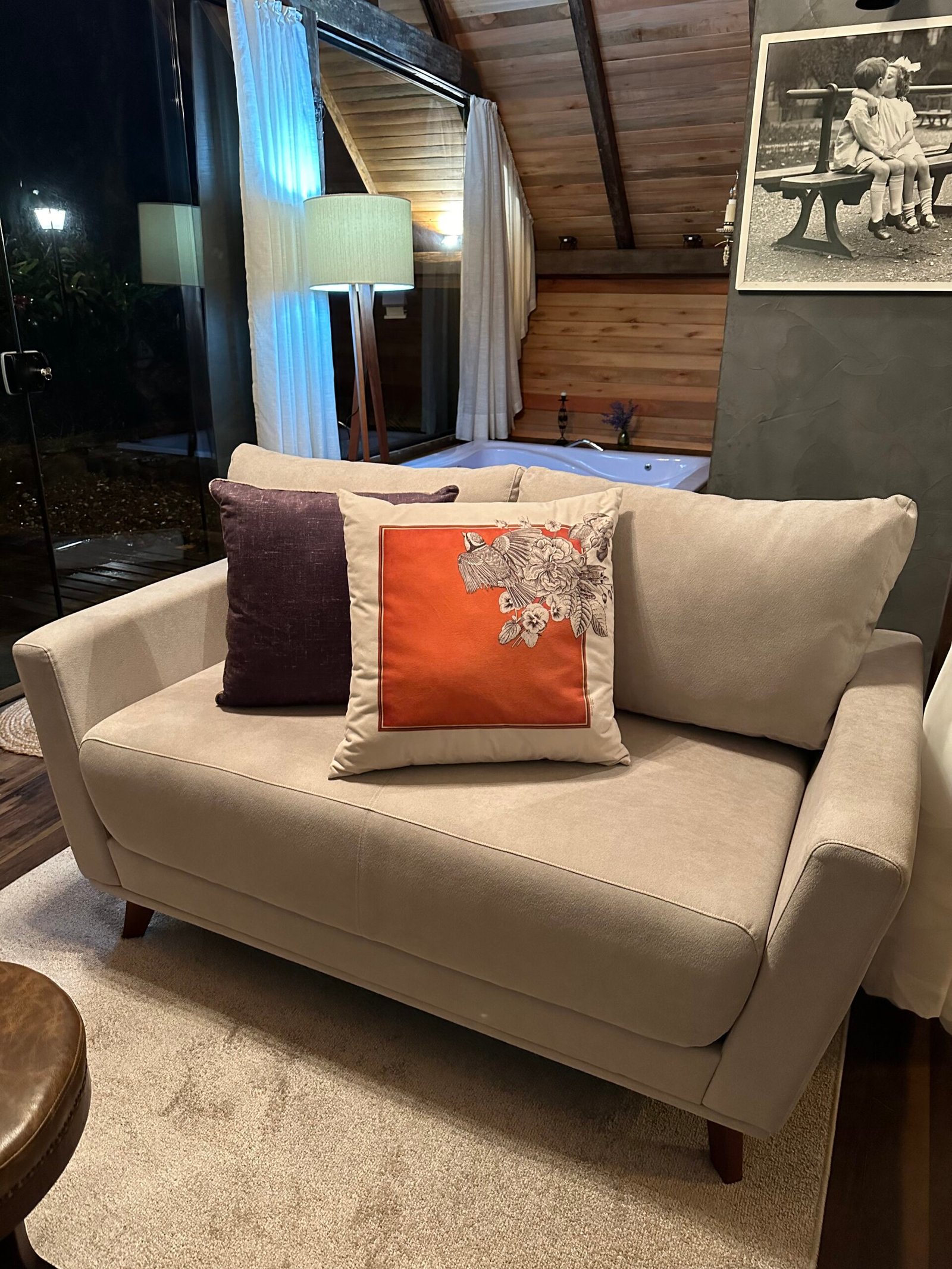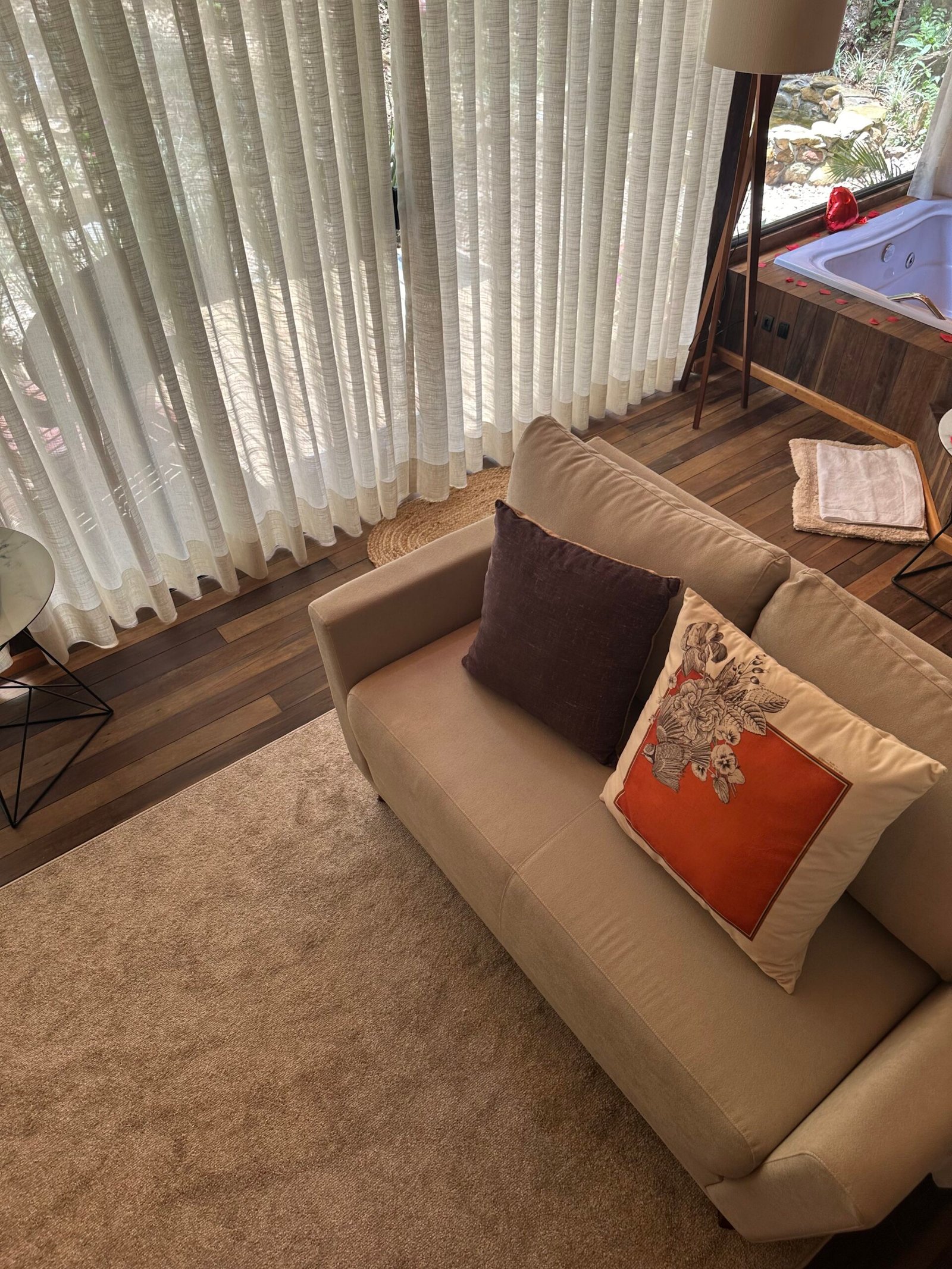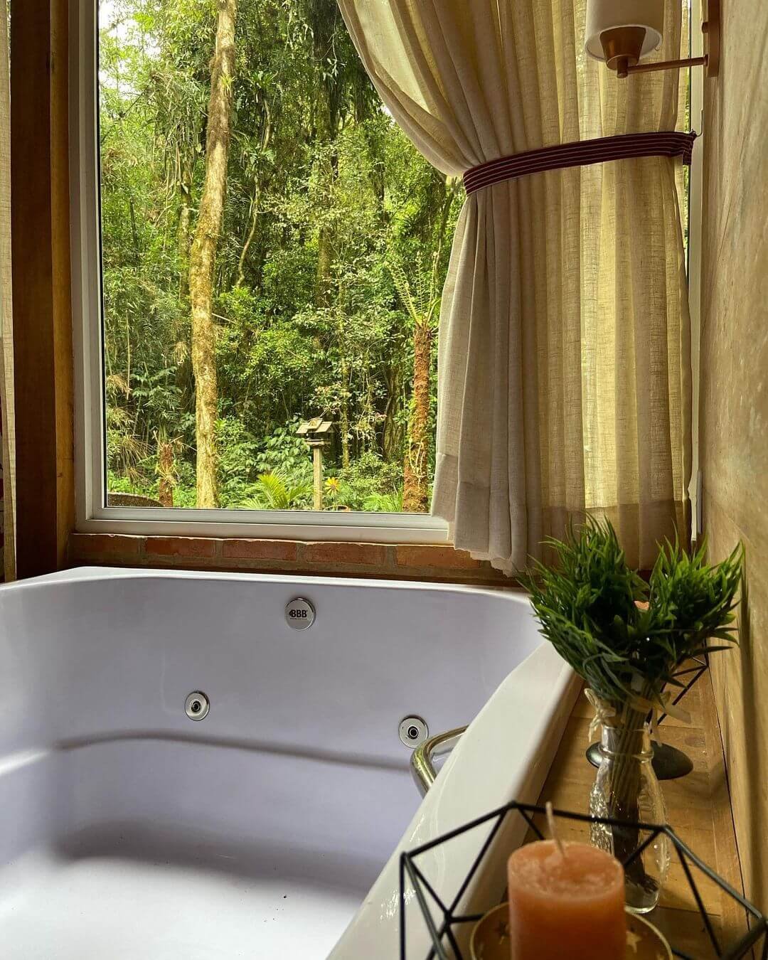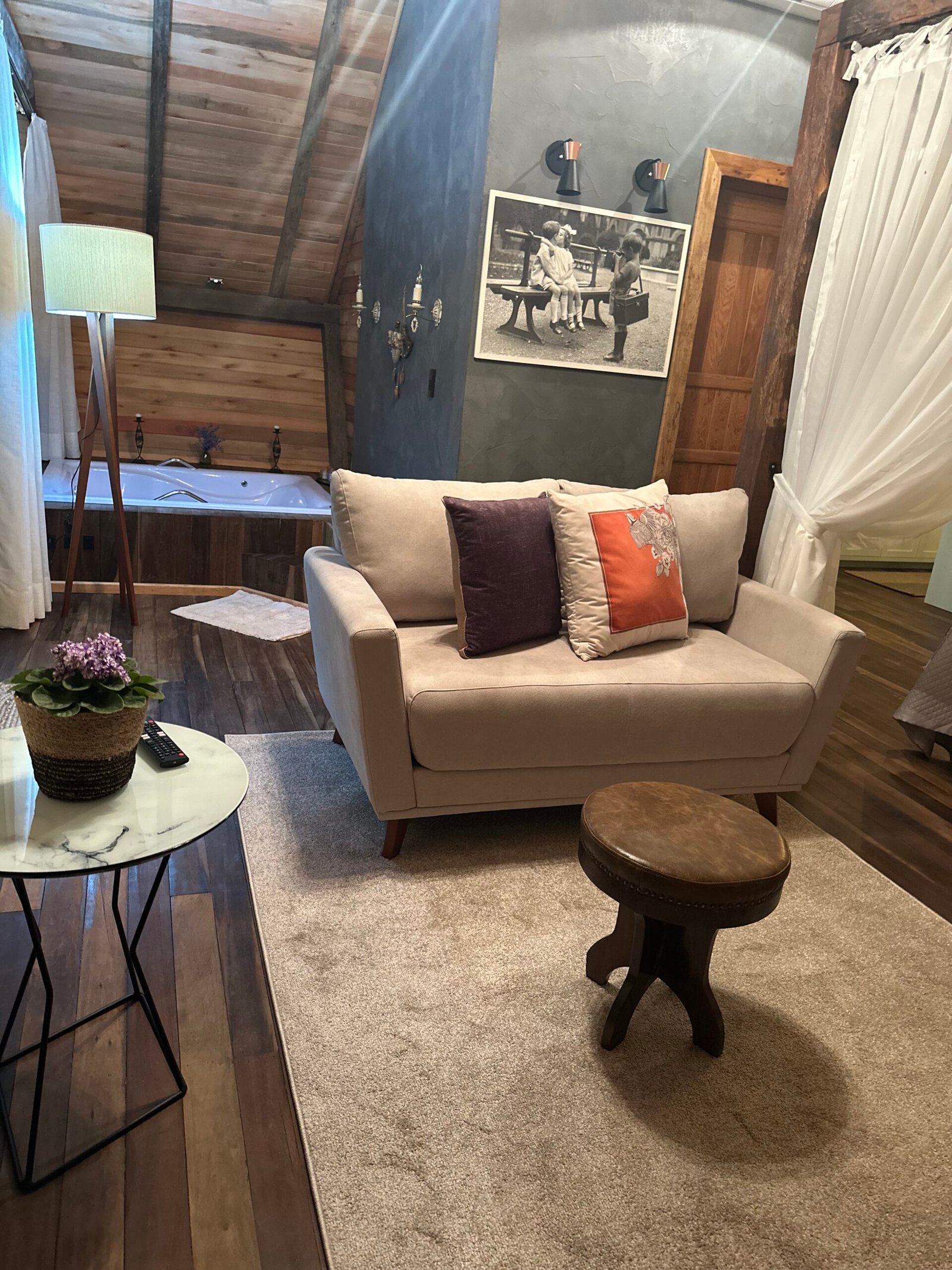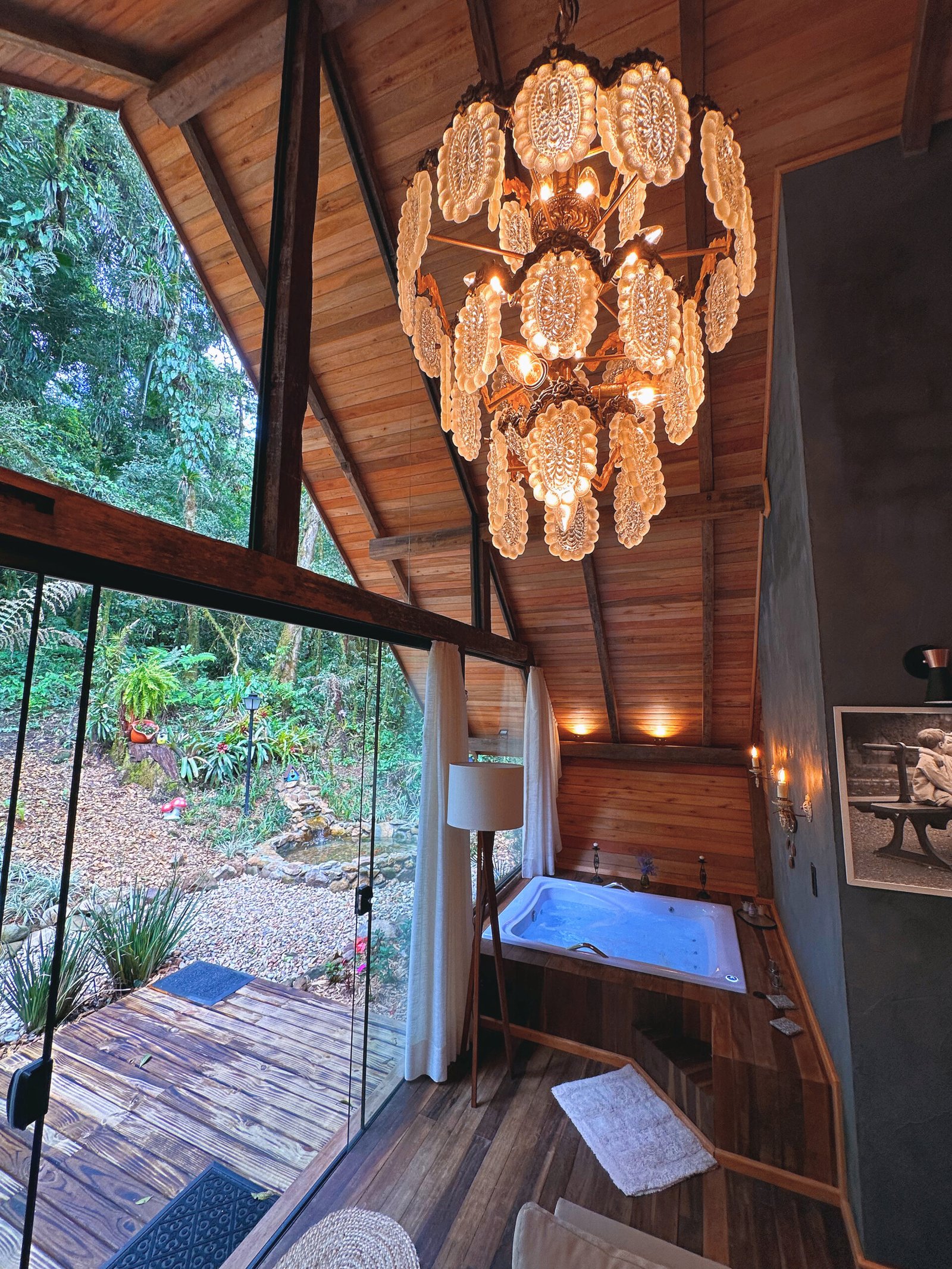 A Cabana do Bosque foi meticulosamente projetada para proporcionar a casais momentos mágicos, onde podem se perder em olhares apaixonados enquanto desfrutam de uma vista espetacular da natureza. Esta experiência é realçada seja na banheira dupla, cuidadosamente selecionada por seu design único, ou na confortável cama King Size, que promete noites de sono tranquilas.