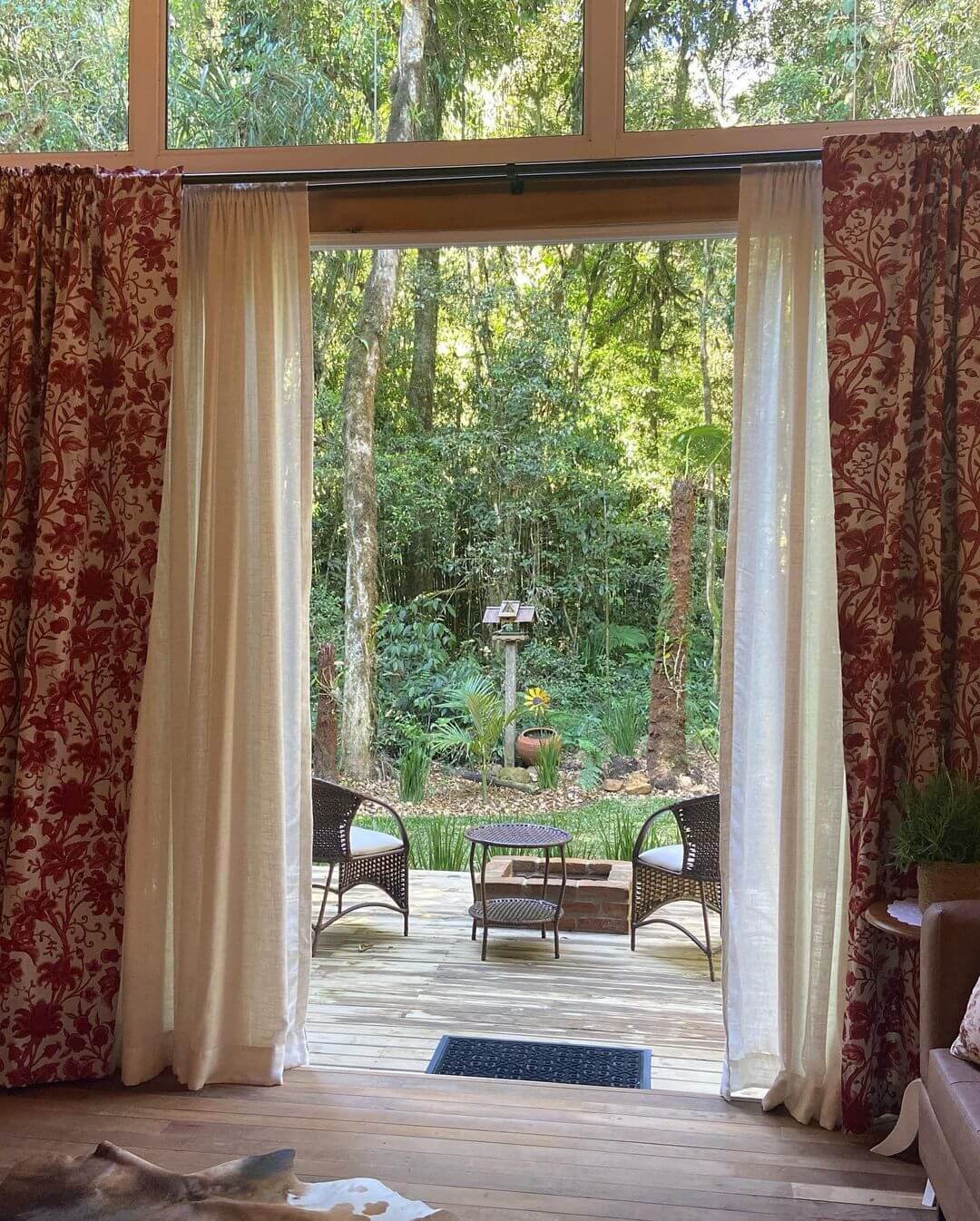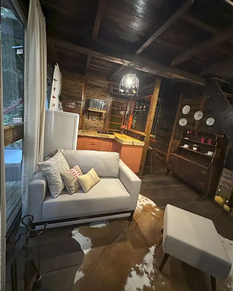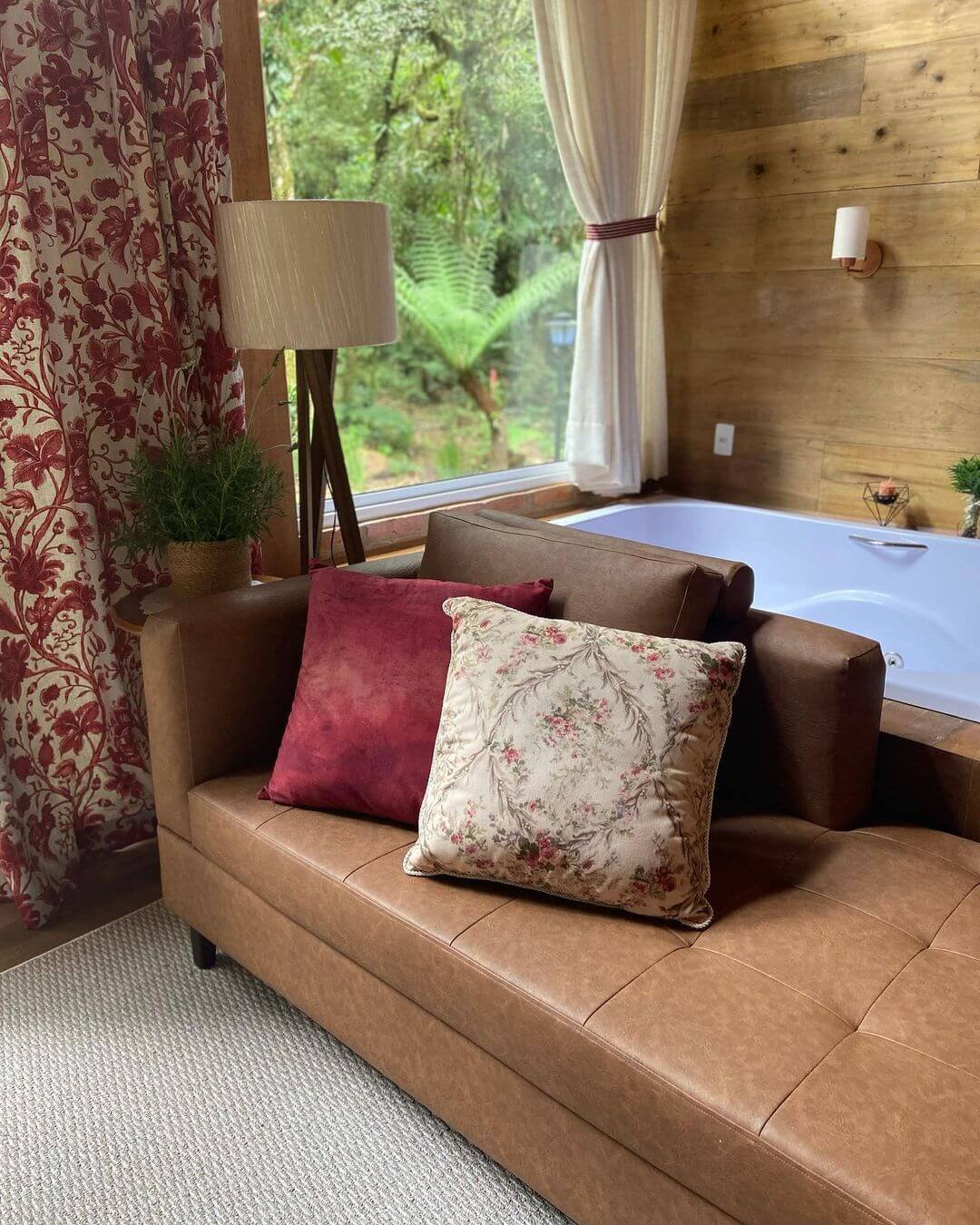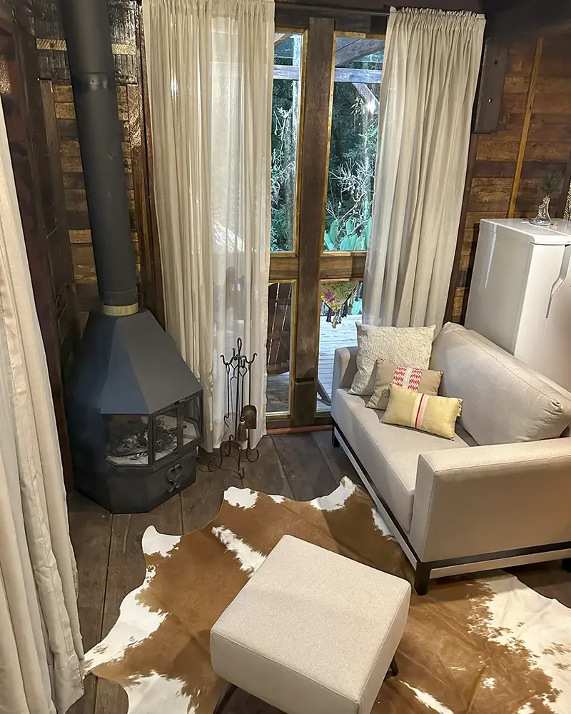 A Cabana do Bosque, perfeita para casais, mistura rusticidade e modernidade. Com lareira e vista da natureza, é ideal para relaxamento íntimo e privacidade.