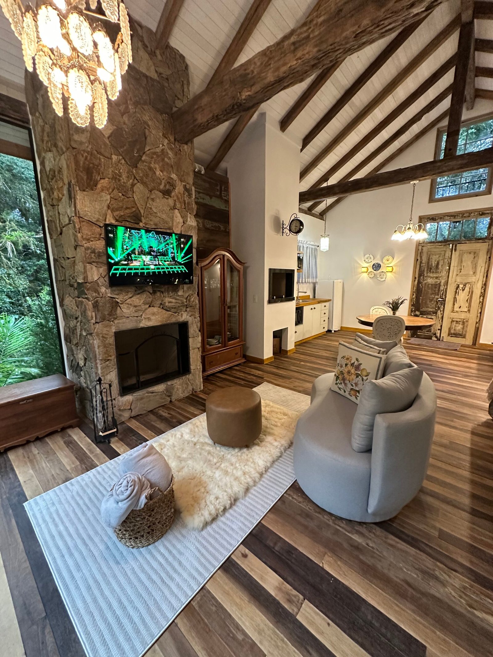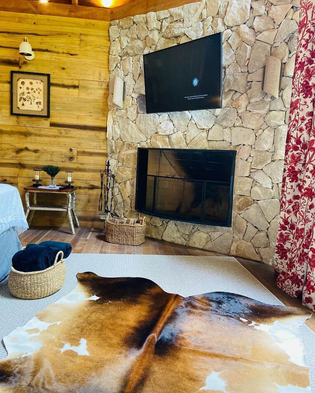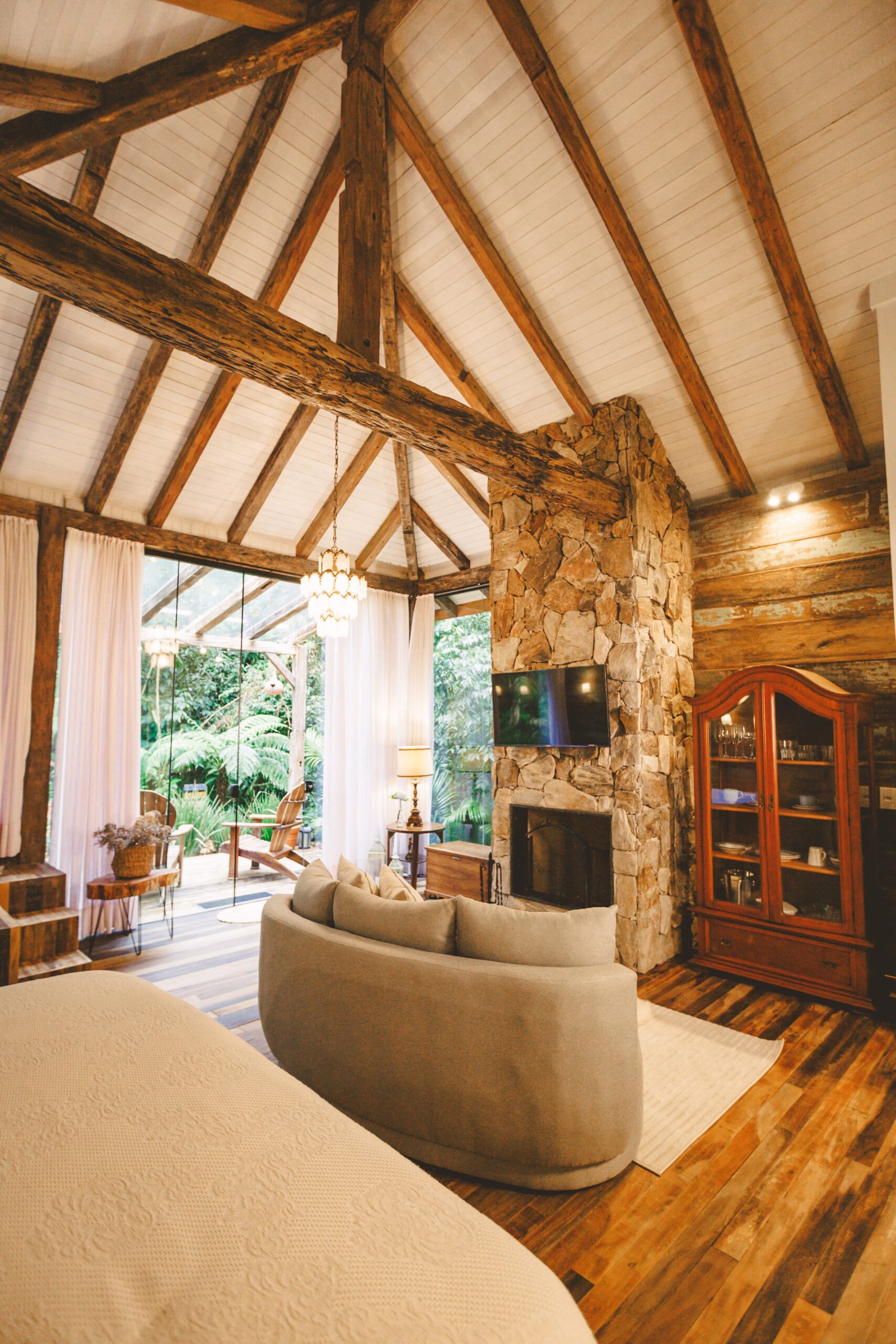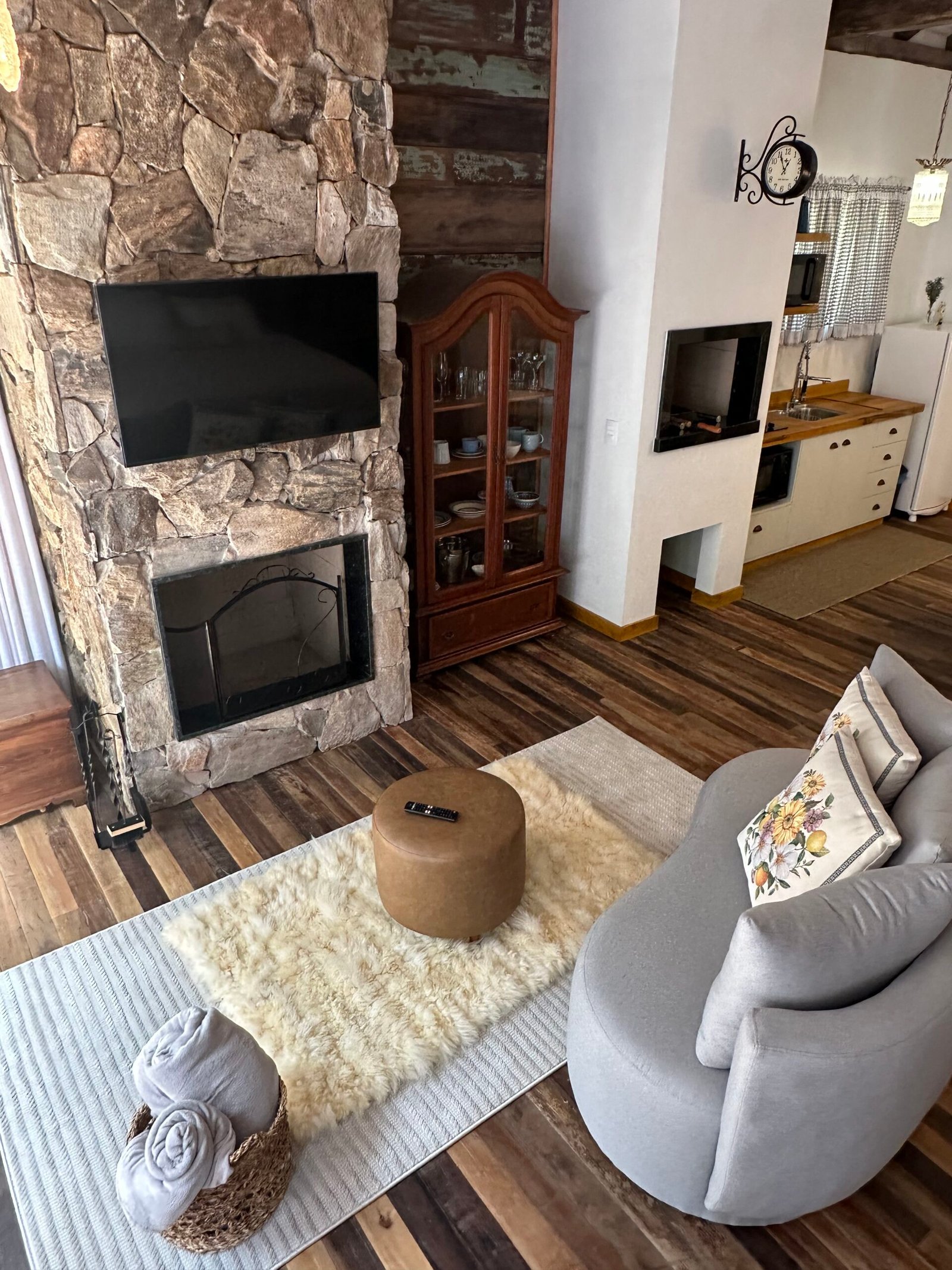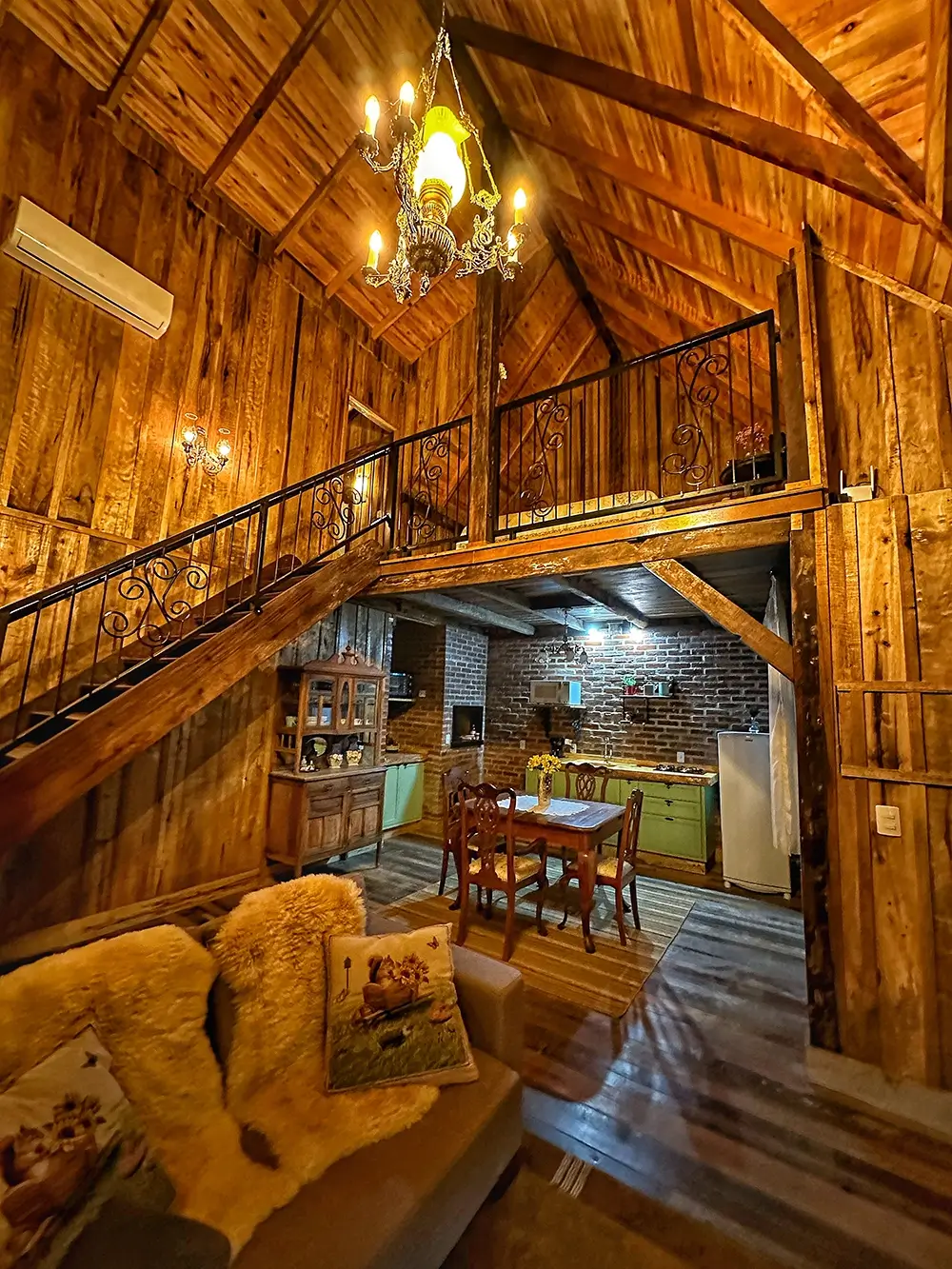 A cabana representa uma harmoniosa combinação entre o charme rústico e a sofisticação moderna. Destaque especial para a majestosa lareira, situada em uma impressionante torre de pedras, que não apenas proporciona calor, mas também adiciona um toque de elegância singular à arquitetura já notável desta cabana.