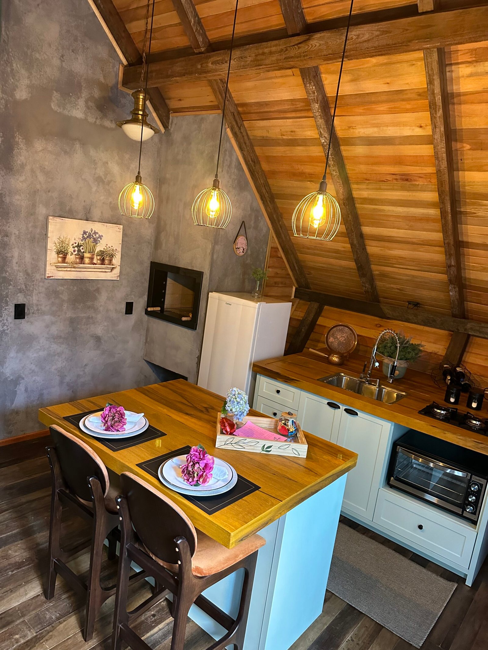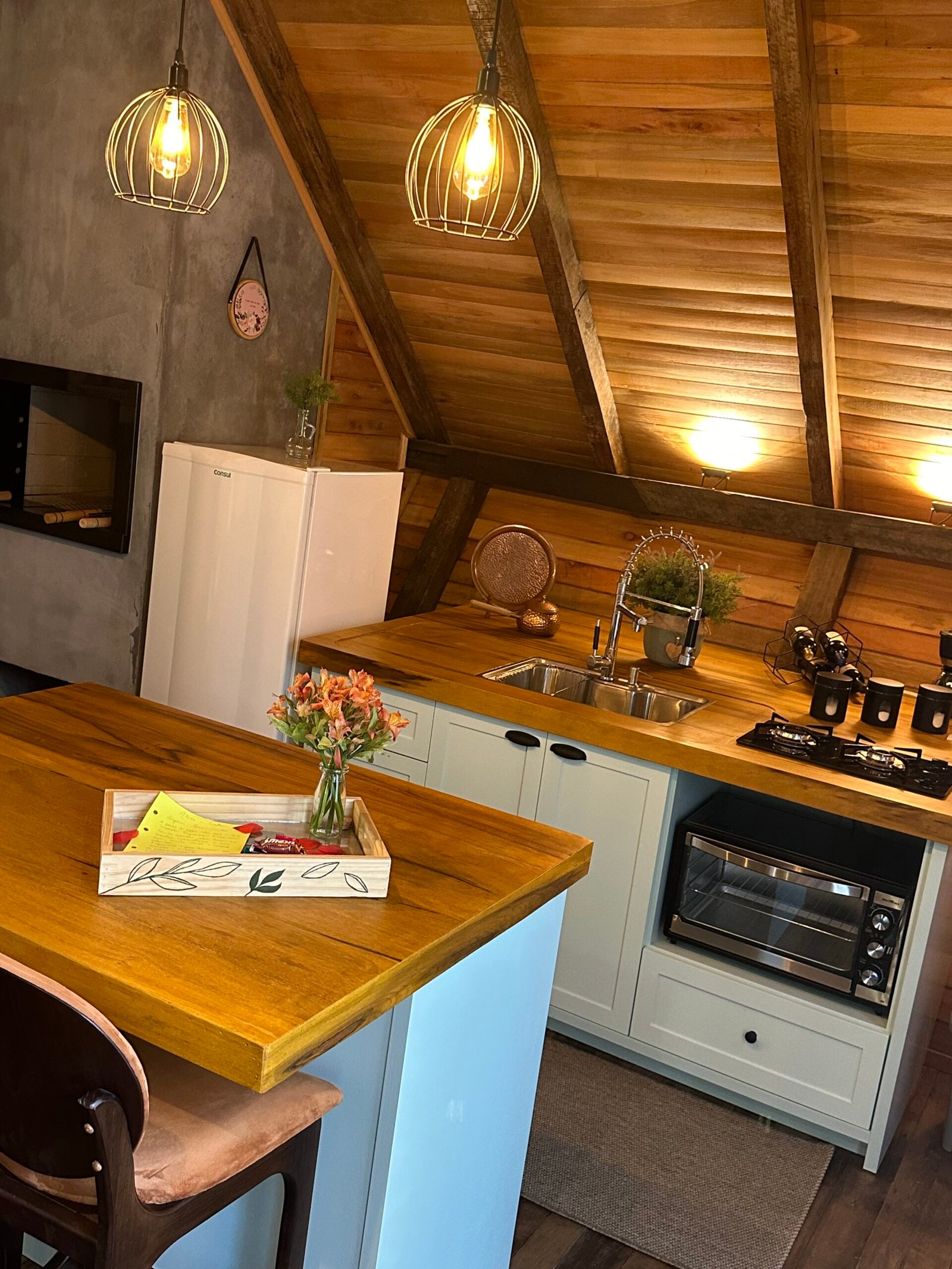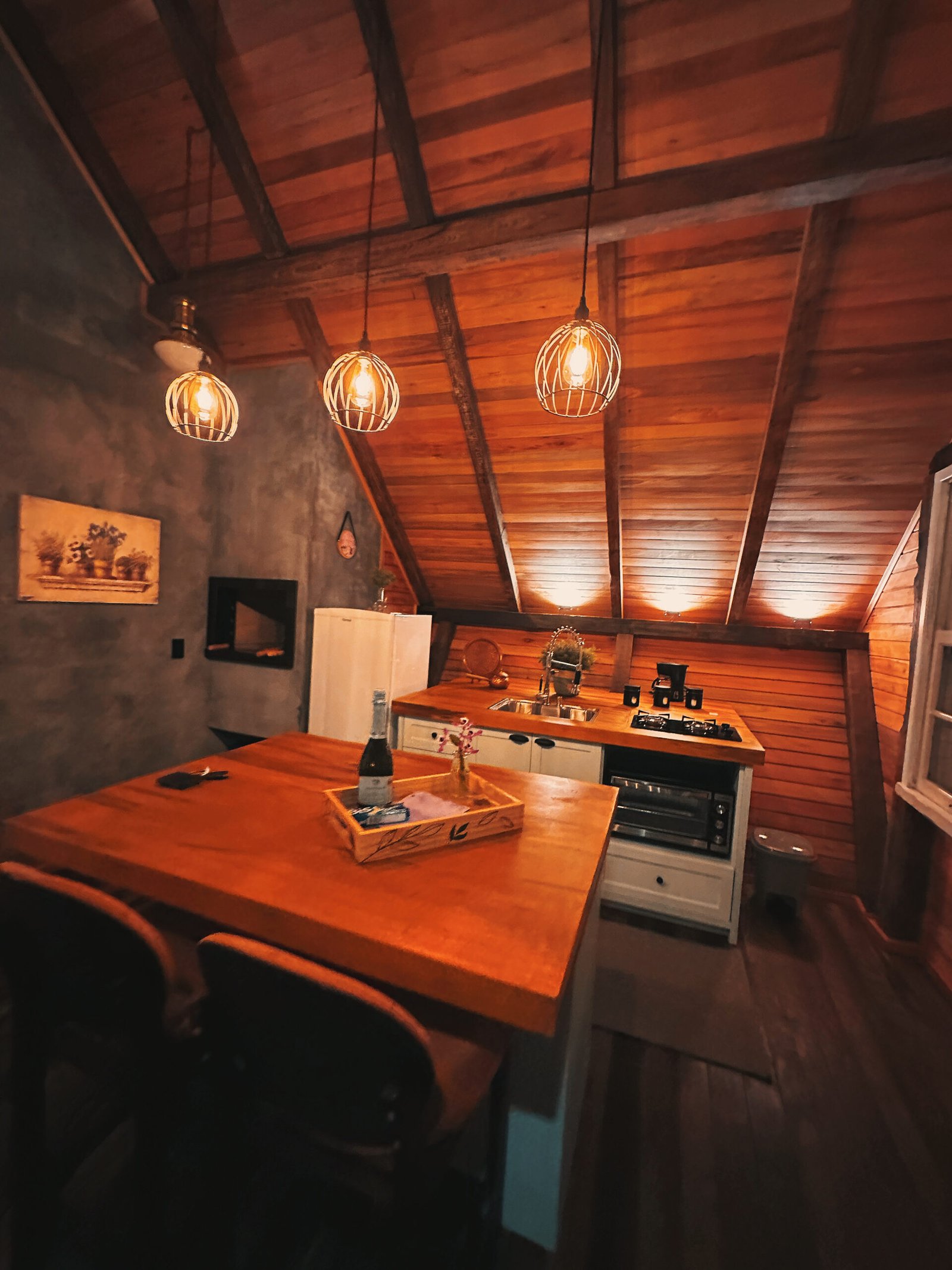 Cada cabana dispõe de uma cozinha cuidadosamente montada e excepcionalmente completa, pensada para proporcionar aos casais a liberdade e o prazer de preparar suas refeições favoritas juntos. Este espaço especial é um convite para que o amor e a intimidade sejam intensificados em um ambiente acolhedor e íntimo.