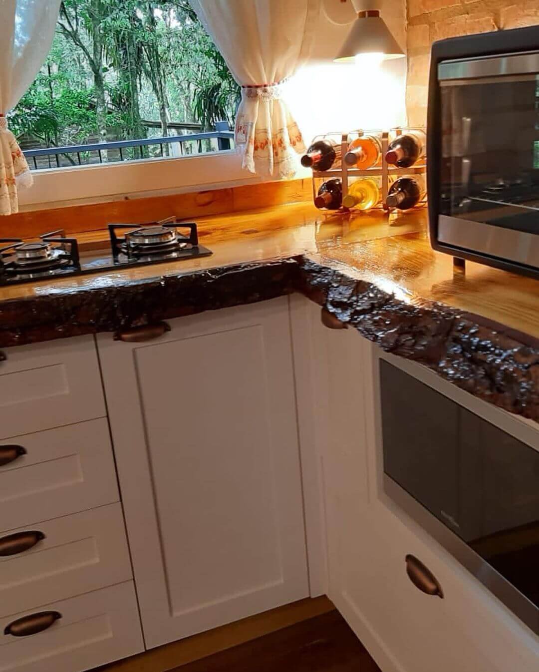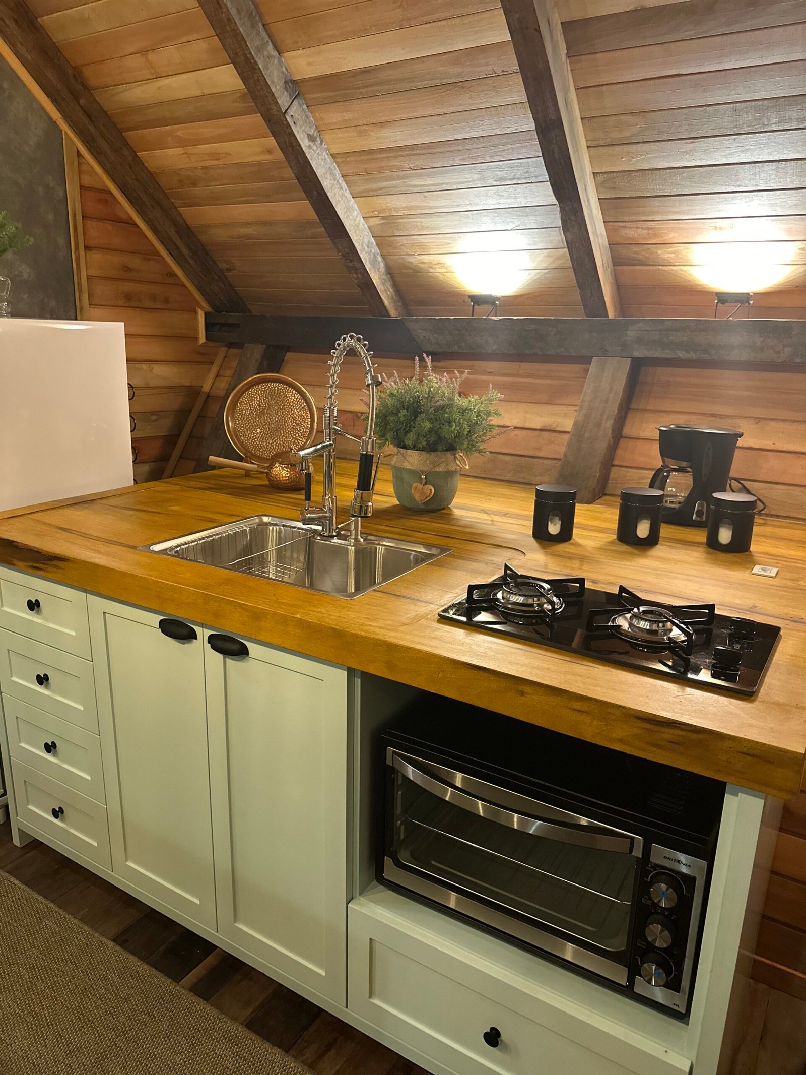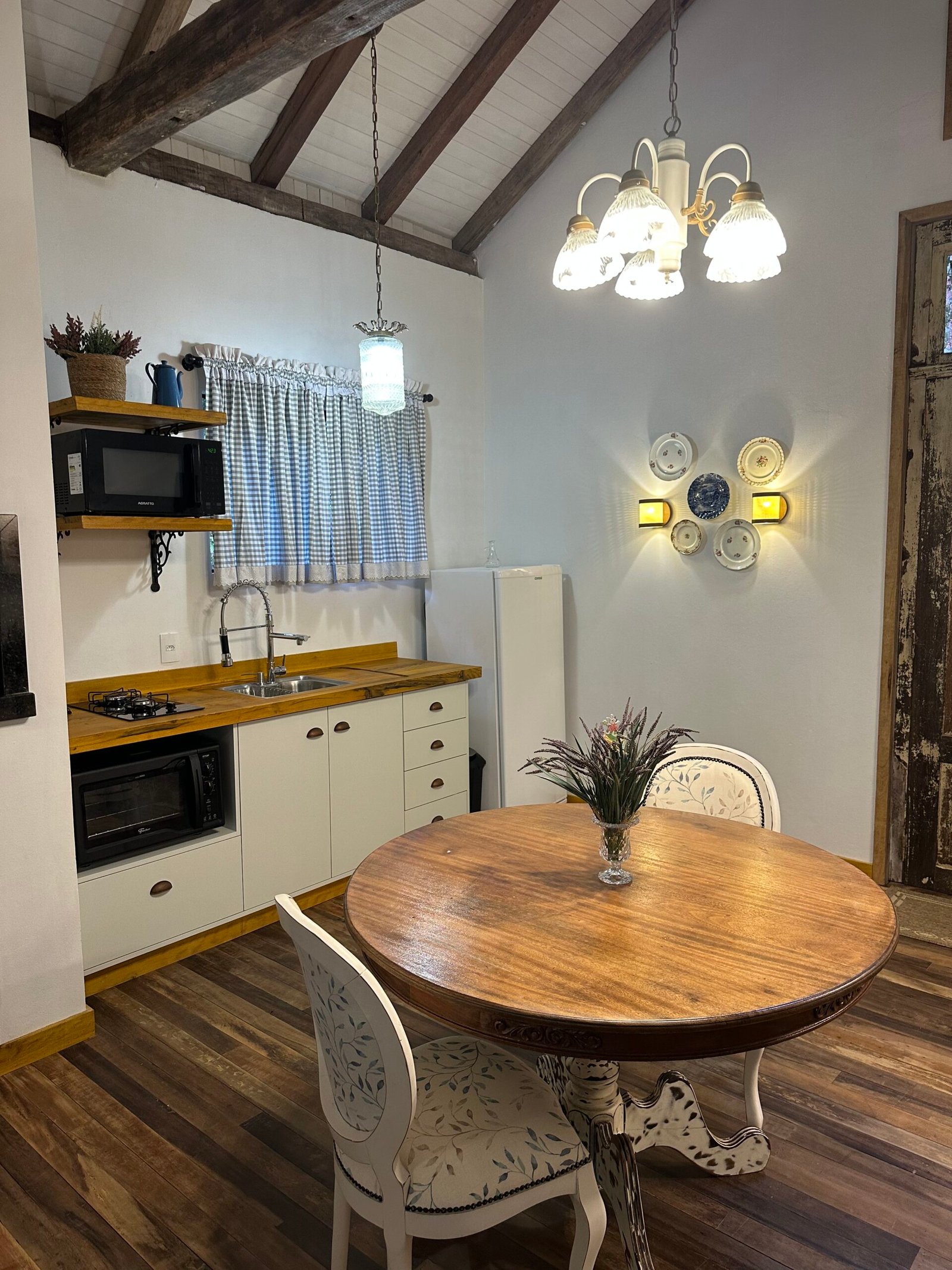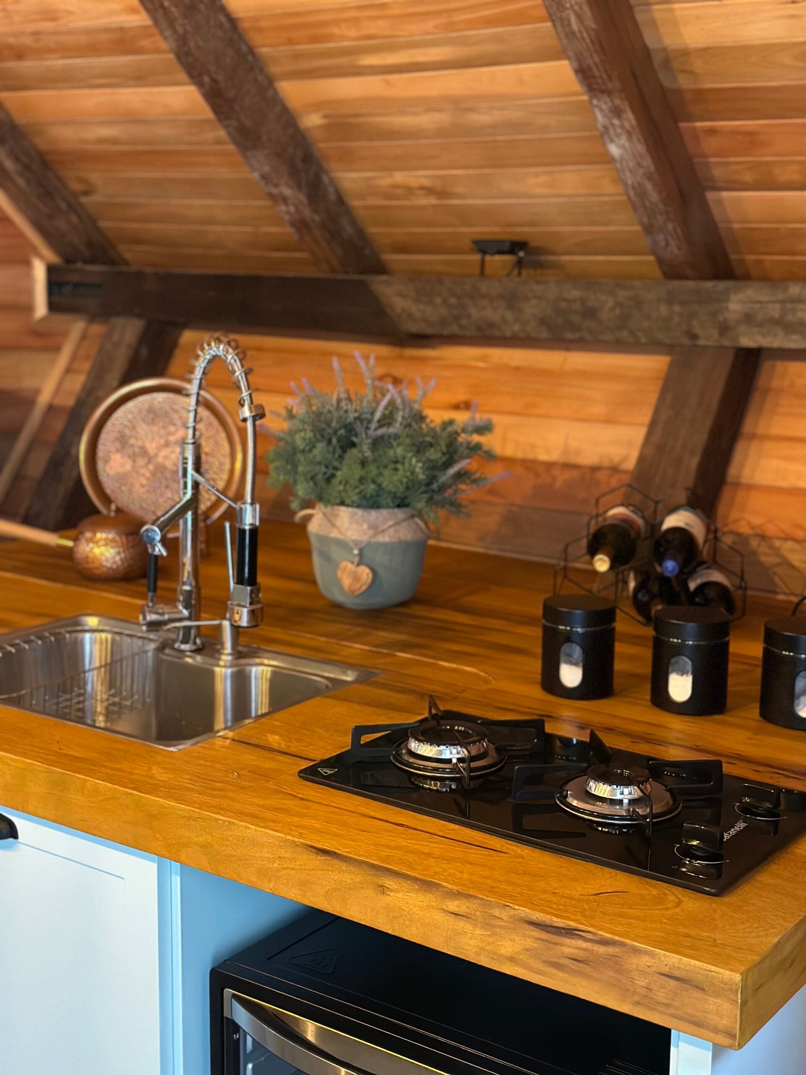 Cada cabana dispõe de uma cozinha cuidadosamente montada e excepcionalmente completa, pensada para proporcionar aos casais a liberdade e o prazer de preparar suas refeições favoritas juntos. Este espaço especial é um convite para que o amor e a intimidade sejam intensificados em um ambiente acolhedor e íntimo.