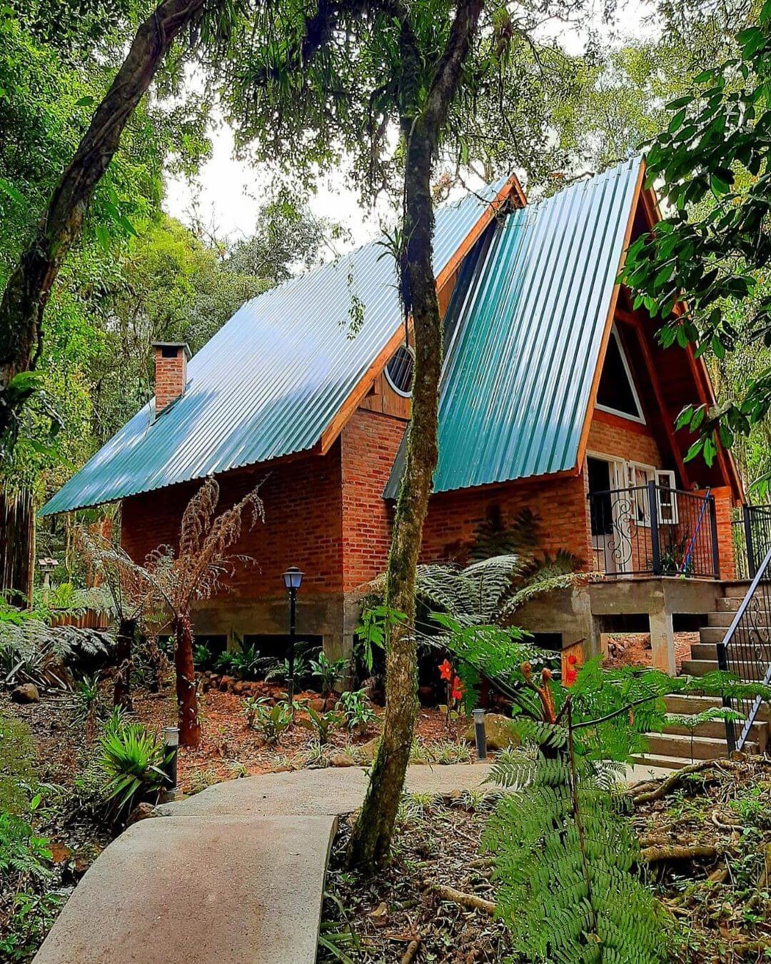 A Cabana das Bromélias é ideal para casais que buscam um toque rústico e moderno na sua estadia, proporcionando um ambiente íntimo e relaxante com lareira e vistas da natureza.