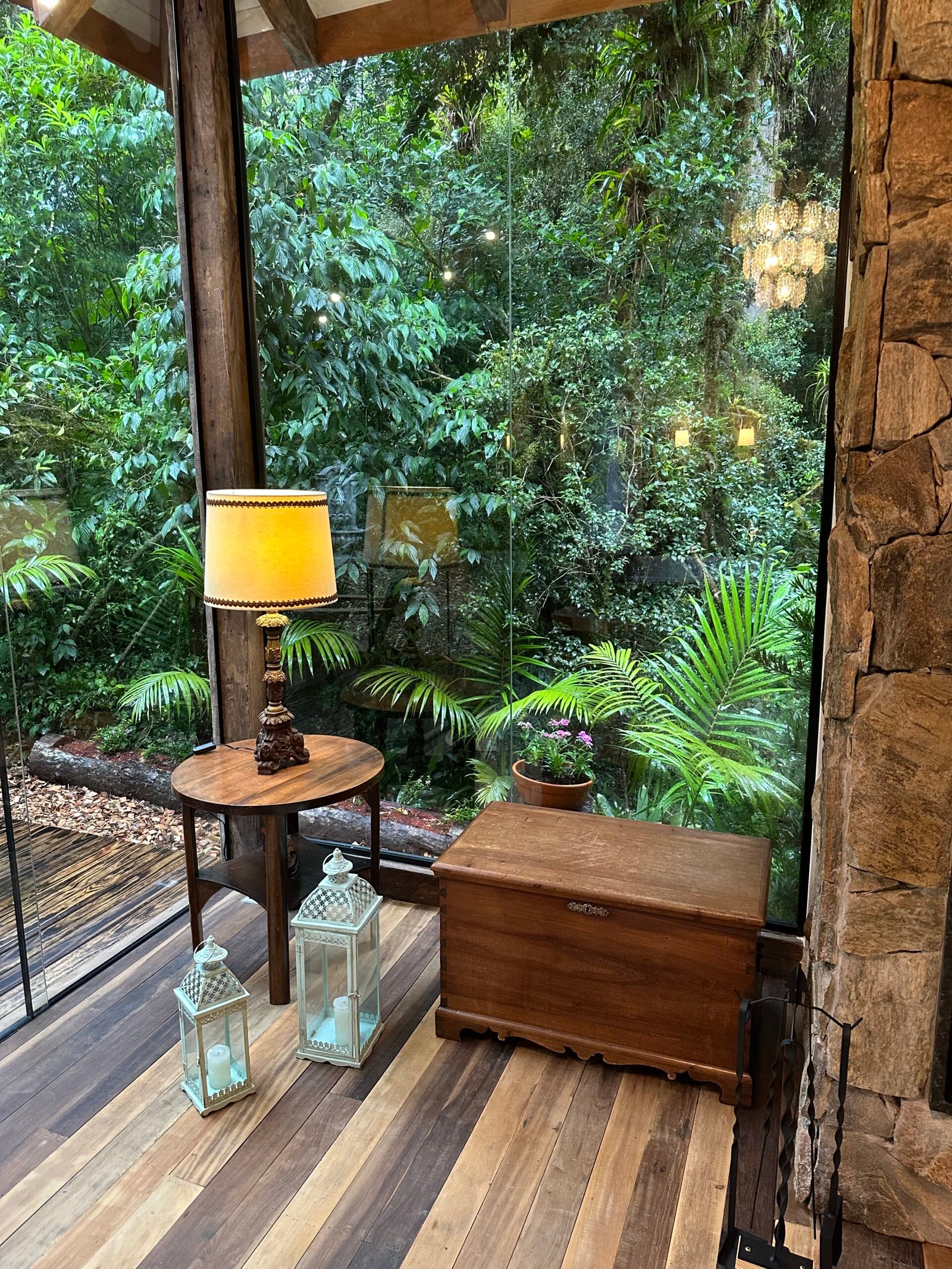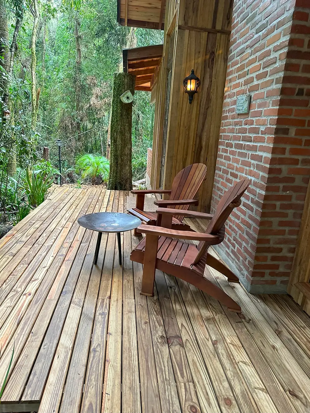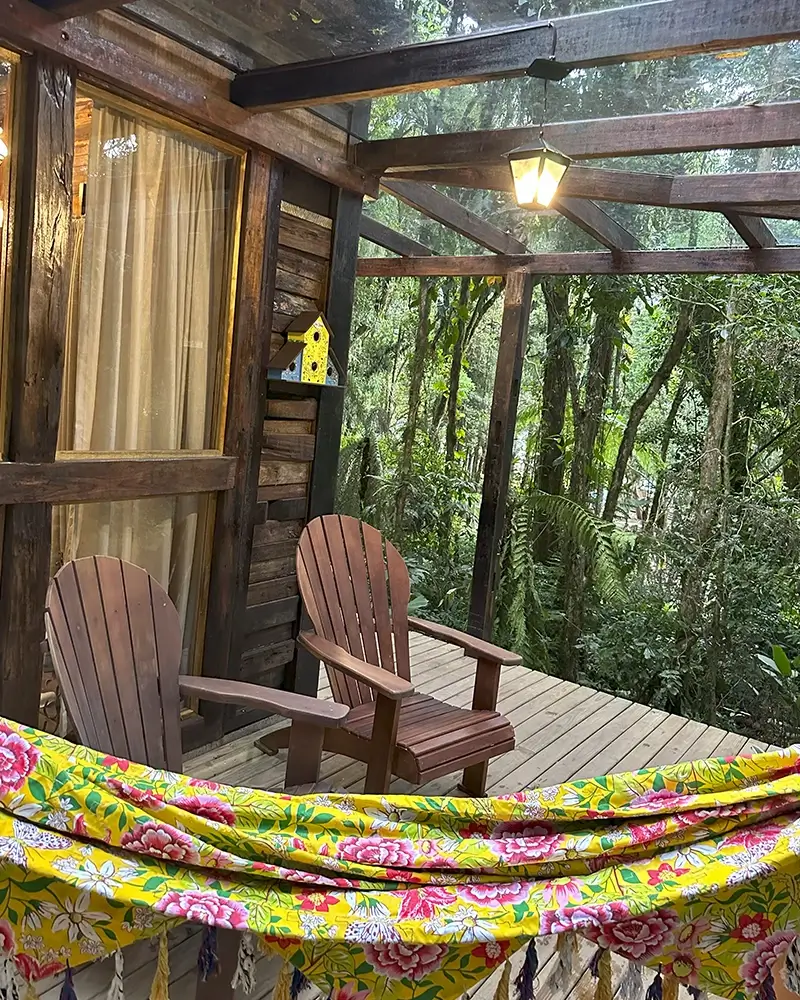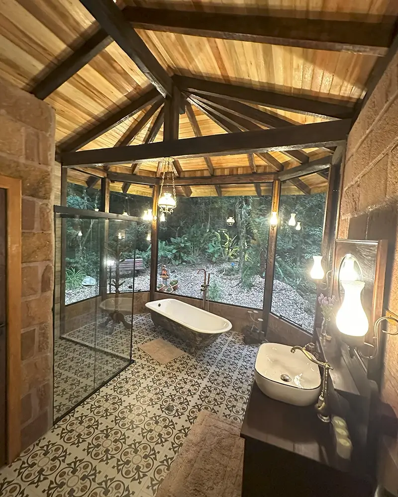 O banheiro é construído com pedras do Rio Grande do Sul, e a banheira de imersão restaurada oferece vistas da cachoeira em dias de chuva e floresta. Relaxe com um livro ou uma bebida ao lado da lareira de ferro na sala. No mezanino, a cama sob um teto de vidro permite admirar o luar, enquanto um deck coberto com vidro, mobiliado com cadeiras, rede e churrasqueira portátil, proporciona uma vista encantadora para o jardim privativo. A Cabana das Bromélias é um refúgio perfeito, combinando luxo e conexão com a natureza.