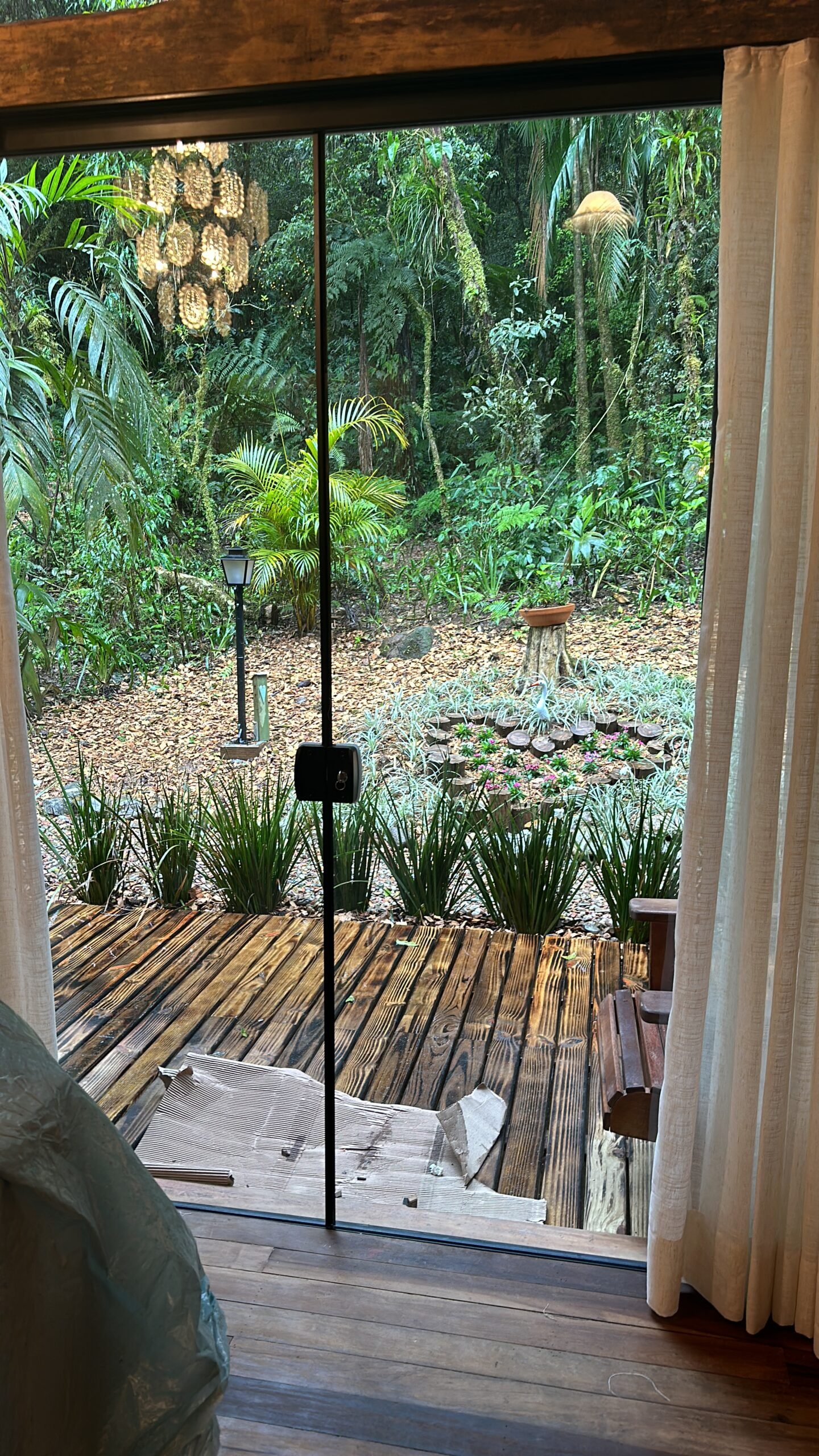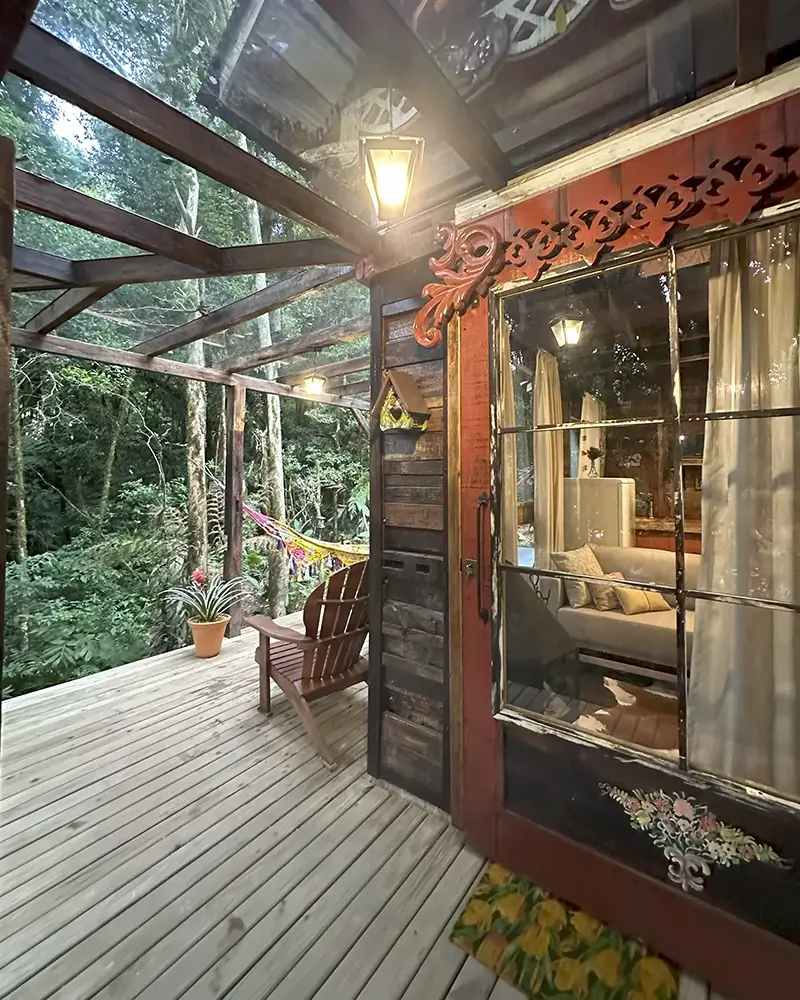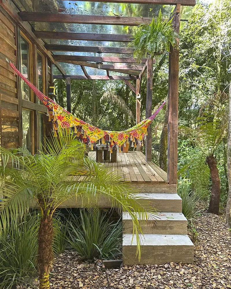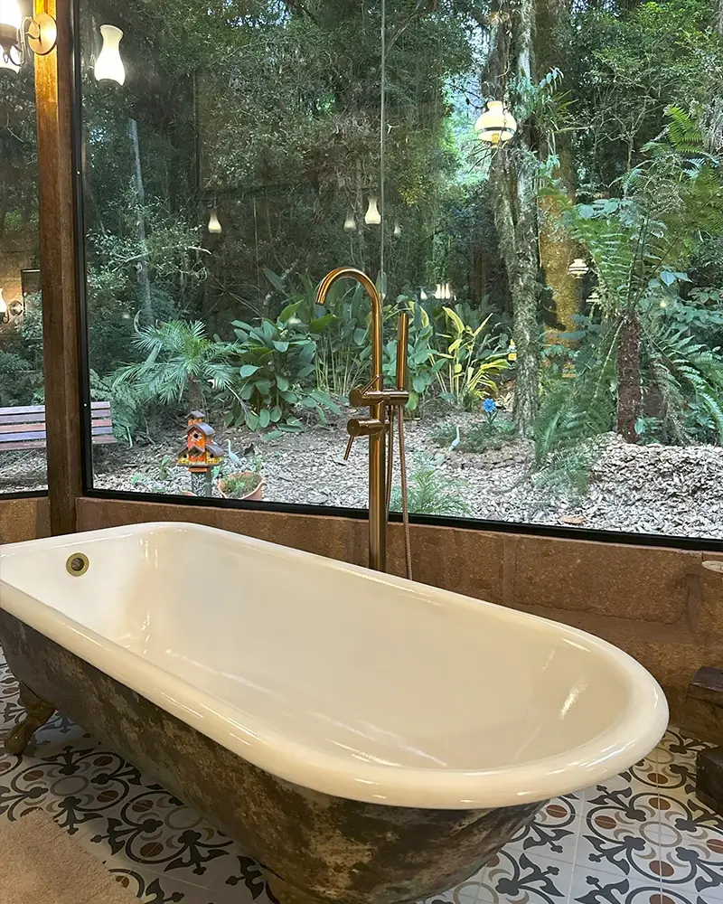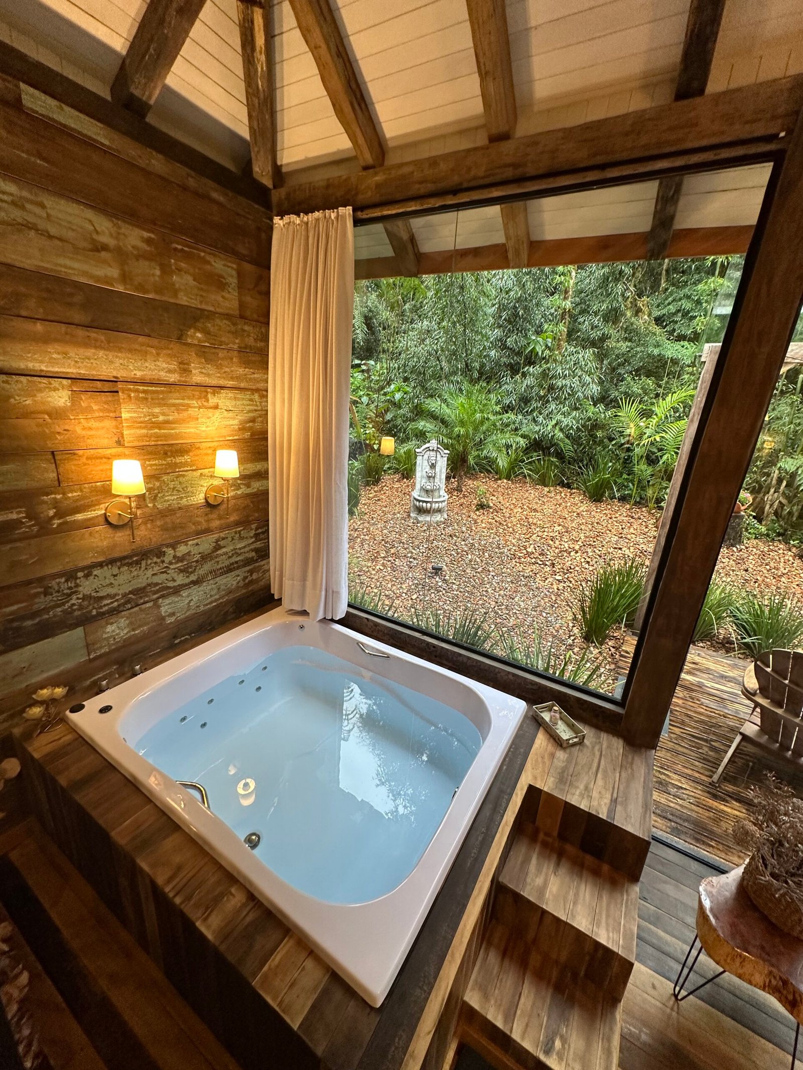 O banheiro é construído com pedras do Rio Grande do Sul, e a banheira de imersão restaurada oferece vistas da cachoeira em dias de chuva e floresta. Relaxe com um livro ou uma bebida ao lado da lareira de ferro na sala. No mezanino, a cama sob um teto de vidro permite admirar o luar, enquanto um deck coberto com vidro, mobiliado com cadeiras, rede e churrasqueira portátil, proporciona uma vista encantadora para o jardim privativo. A Cabana das Bromélias é um refúgio perfeito, combinando luxo e conexão com a natureza.