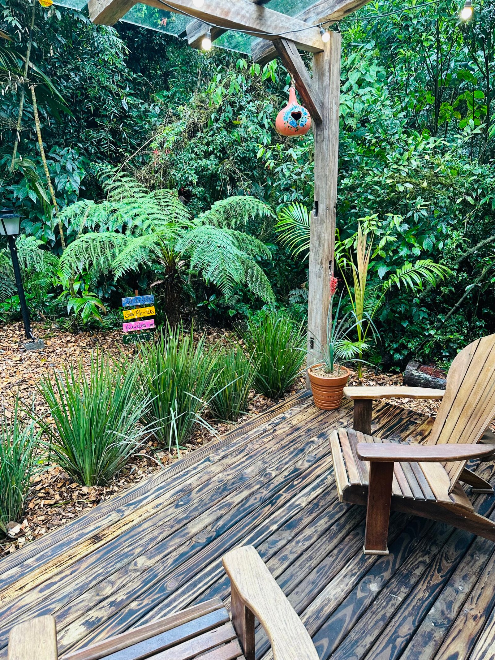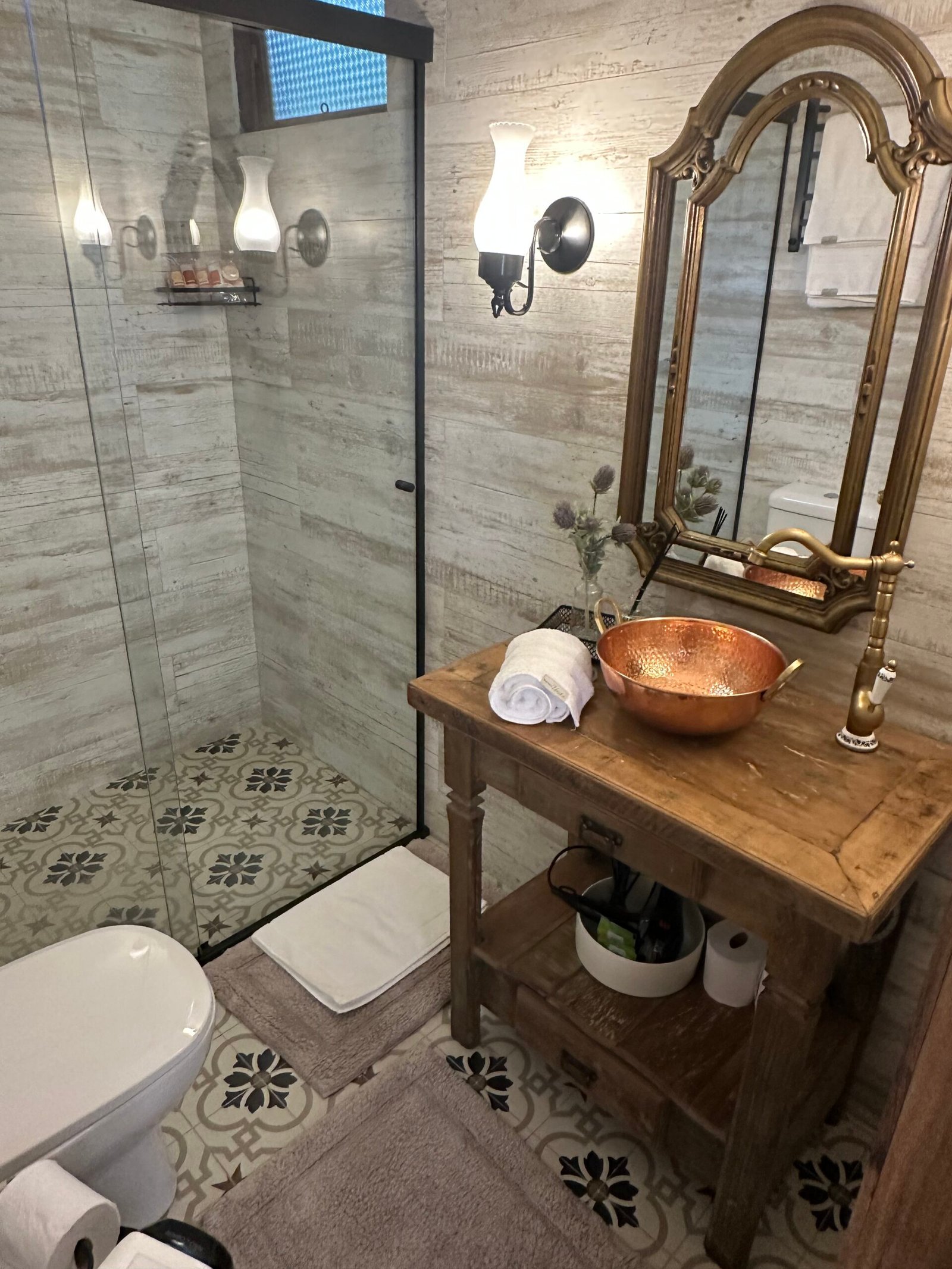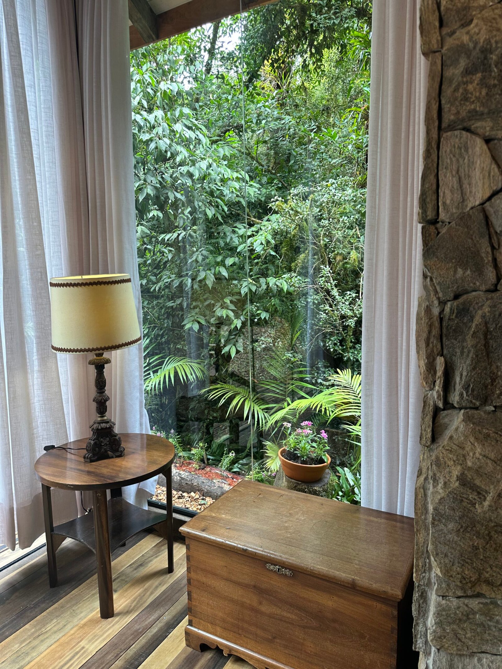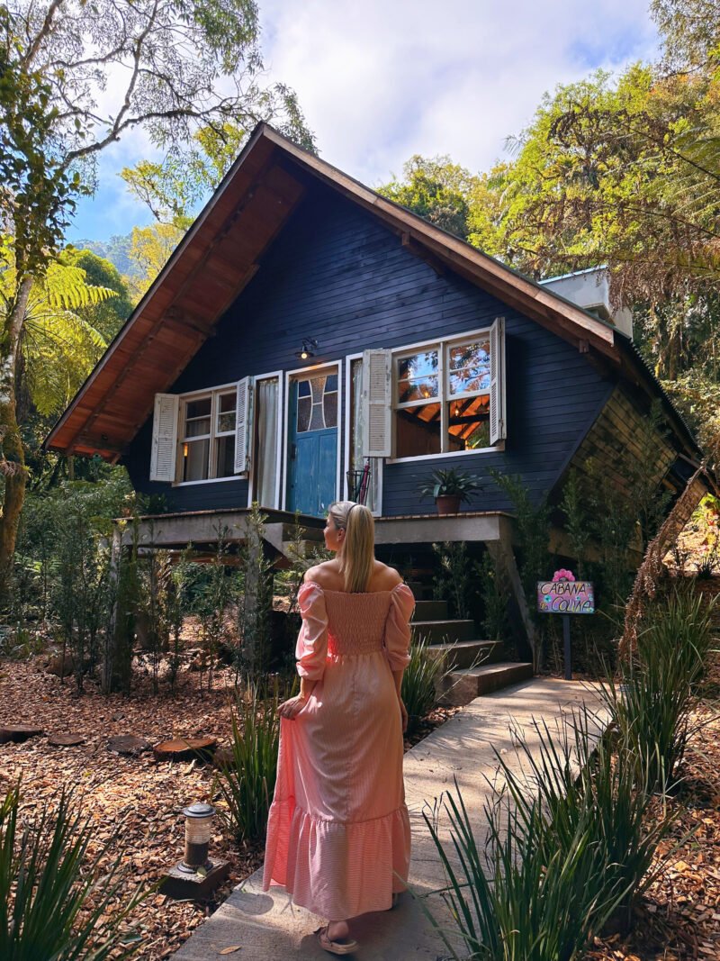O banheiro é construído com pedras do Rio Grande do Sul, e a banheira de imersão restaurada oferece vistas da cachoeira em dias de chuva e floresta. Relaxe com um livro ou uma bebida ao lado da lareira de ferro na sala. No mezanino, a cama sob um teto de vidro permite admirar o luar, enquanto um deck coberto com vidro, mobiliado com cadeiras, rede e churrasqueira portátil, proporciona uma vista encantadora para o jardim privativo. A Cabana das Bromélias é um refúgio perfeito, combinando luxo e conexão com a natureza.