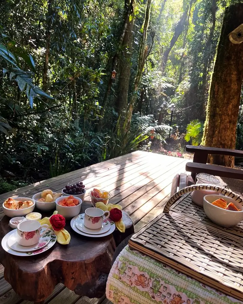 Este café é cuidadosamente entregue na varanda da sua Cabana, em uma charmosa cesta, no horário que preferir. Preparado com carinho e atenção aos detalhes, ele promete começar o seu dia de maneira especial e romântica, criando um momento inesquecível para o casal.