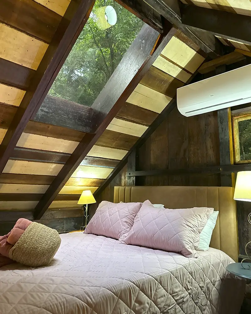 Situada ao lado de um imponente Cedro, a Cabana do Cedro é uma obra de arte rústica, adornada com antiguidades que conferem uma personalidade única ao ambiente. No mezanino, repousa uma confortável cama king size, complementada por um closet, enquanto a sala no piso térreo é equipada com TV e sofá-cama aconchegante. O destaque fica por conta da esplêndida banheira de hidromassagem, estrategicamente posicionada para oferecer vistas encantadoras da mata e de uma impressionante parede de pedras, proporcionando aos casais apaixonados momentos de conexão profunda e memorável.