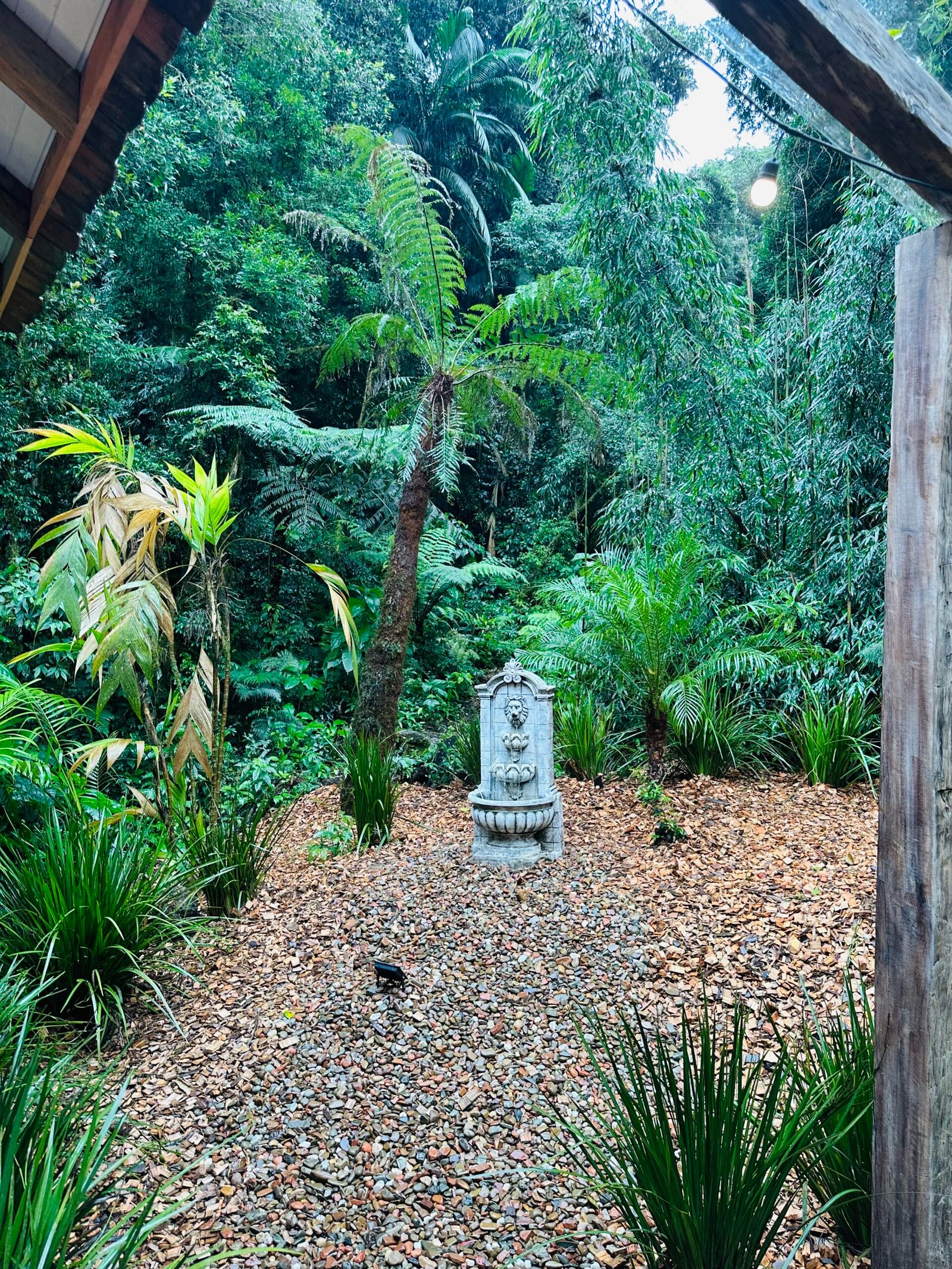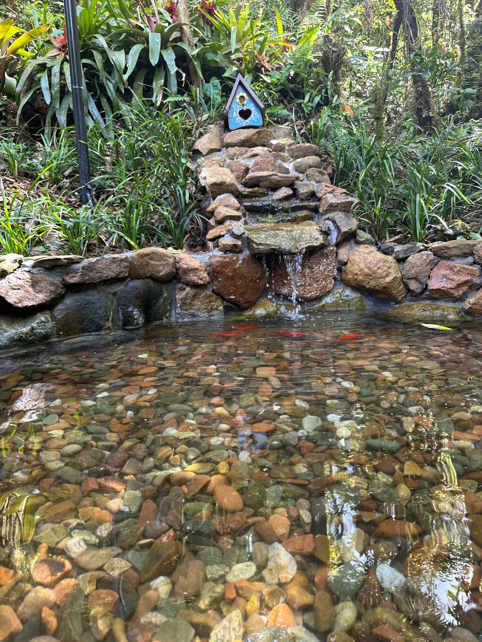 Seus jardins privativos são um espetáculo à parte, trazendo a sensibilidade a cada detalhe, com árvores frutíferas, flores, casinhas de passarinhos, uma mesa e cadeiras feitos de caules da própria mata e um lago com cascata e peixes ornamentais.